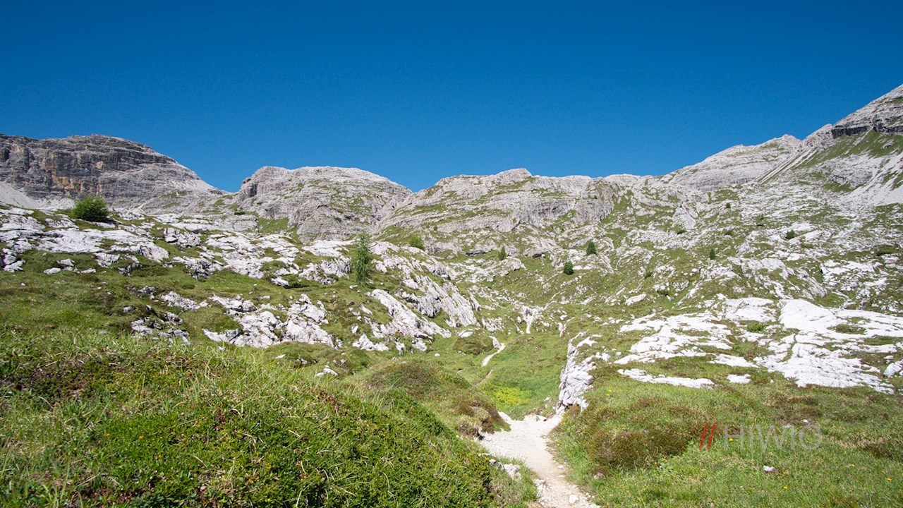 From the Zsigmondy mountain hut, the path no. 101 leads in a mostly gentle ascent through stone-covered mountain meadows and partly rocky, partly rugged terrain to the hospitable Rifugio Pian di Cengia mountain hut. This charming mountain hut, surrounded by a dolomite-white mountain landscape at 2,520 m above sea level, is by the way the smallest and at the same time the highest in the Dolomites of Sesto.