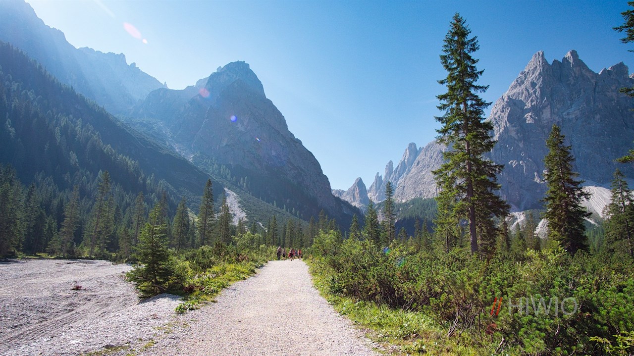 Here the hiking trail no. 102 towards the Rifugio Zsigmondy mountain hut starts. It winds almost flat through the lightly wooded Val Fiscalina to the charming Rifugio Fondo Valle mountain hut, surrounded by imposing rock giants.