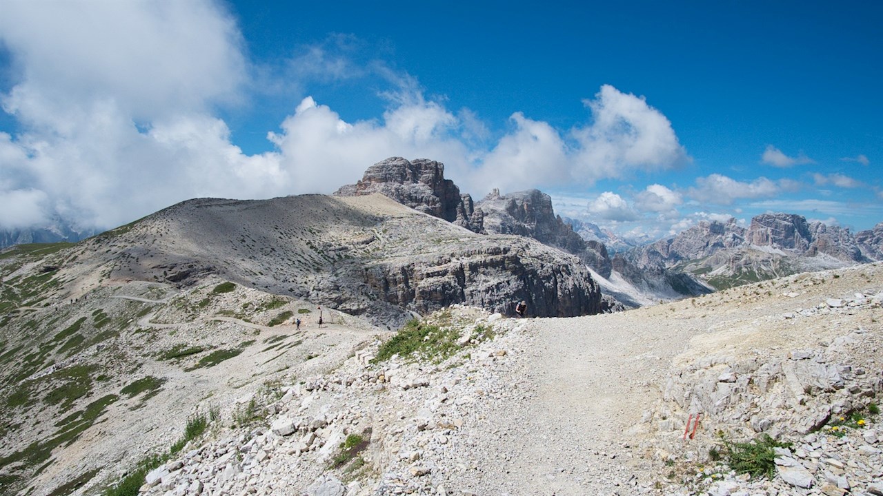 Continuing to follow path number 101 in the direction of the Rifugio delle Tre Cime di Lavaredo, the rather wide mountain path winds its way up to the nearby, somewhat higher Forcella Pian di Cengia pass, from which it initially descends quite steeply over scree. With a view of the historic Monte Paterno and the Lago dei Piani lakes shimmering in the sun, it finally leads gently up and down to what is probably the most visited mountain hut in South Tyrol and the Dolomites: the Rifugio delle Tre Cime di Lavaredo at the foot of the world-famous Tre Cime di Lavaredo.