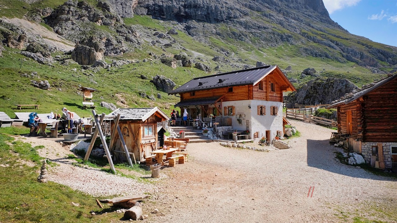 After a total of about three hours of steady hiking, this popular mountain hut at the foot of the Sasso Piatto invites you to a delightful stop. On the sun-warmed panoramic terrace and in the cozy guest rooms, hikers are served traditional South Tyrolean dishes refined with mediterranean lightness and homemade cakes. Combined with the breathtakingly beautiful view of the numerous mountains towering all around and the Alpe di Siusi, a stop at the Sasso Piatto mountain hut becomes an unforgettable experience.
