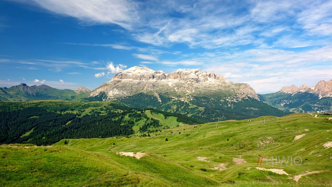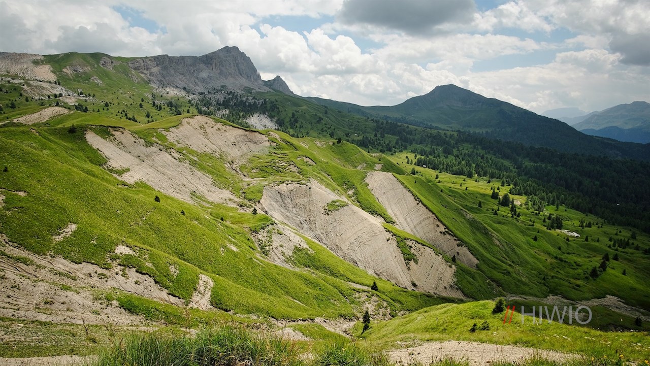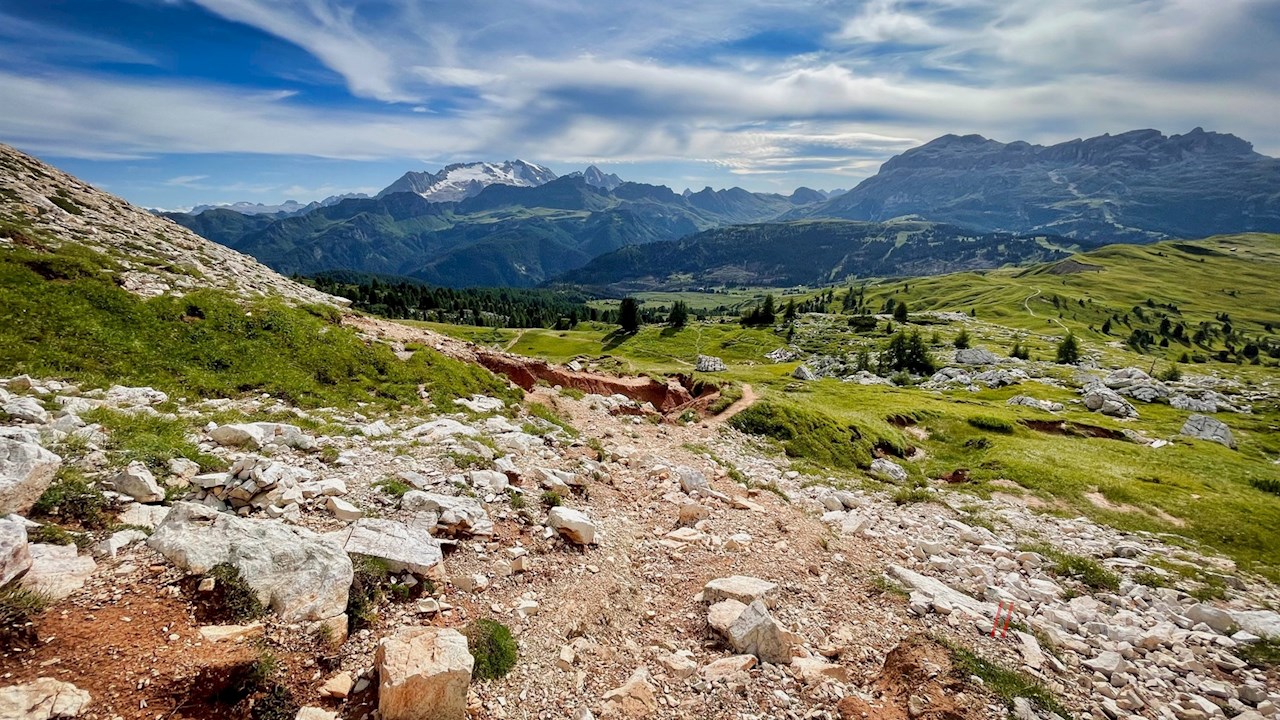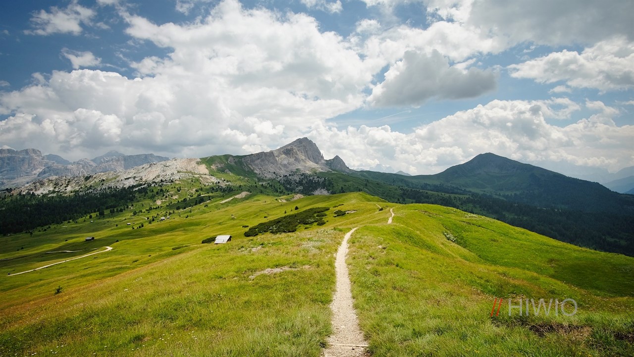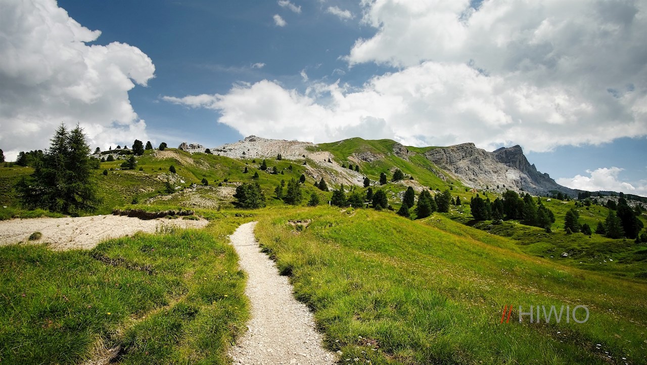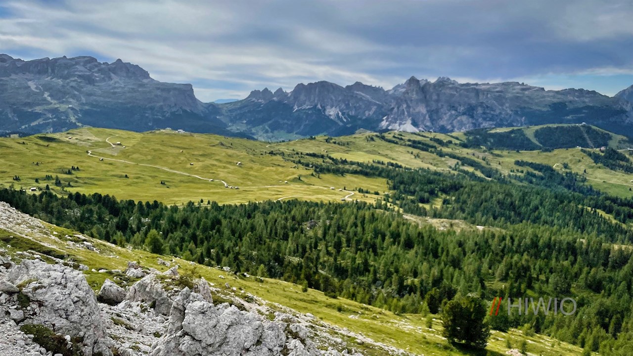 It first leads past the shimmering Valparola lake and then meanders gently up and down through the landscape at the foot of the Settsass, which is partly covered with larches and grass and partly strewn with stones, boulders and rocks. On the way, breathtakingly beautiful views open up into the Val Badia valley and the surrounding towering mountains. In particular, the Sassongher peak, the Gardenacia plateau, the Putia and the nearby Lagazuoi stand out.