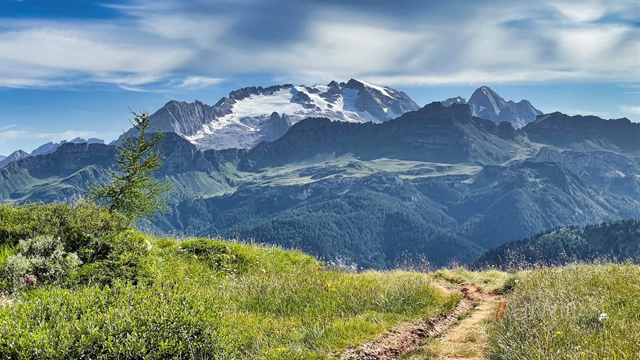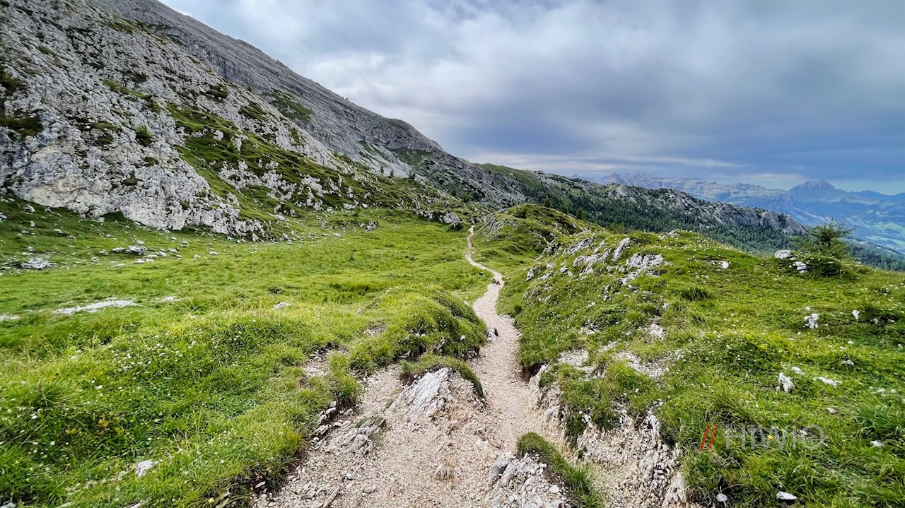 Finally, on the left side of the path, the ascent to the Settsass branches off. But we continue to follow the path towards Pralongia, which now winds through picturesque alpine meadows covered with countless flowers in the warm season on the Störes.