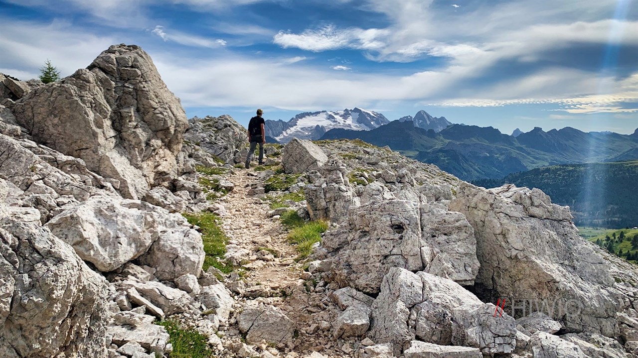 Hiking from Valparola pass to Pralongia moutain hut on Pralongia