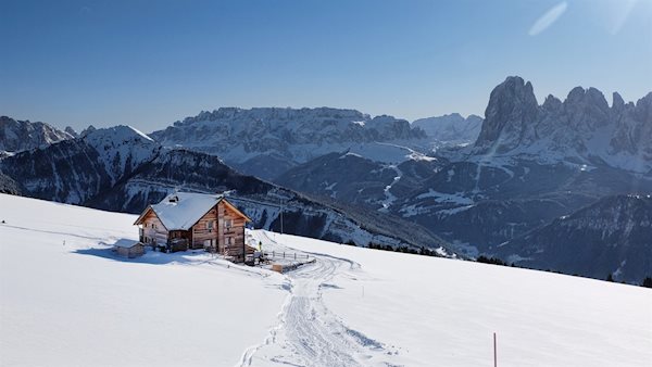 You start the winter hike following the trail no. 35 into the direction of the Resciesa alpine hut. After an easy 30-minute hike up you reach the idyllic mountain hut, which in summer is surrounded by colorful alpine flowers and welcomes guests on a sun terrace. In winter it is the perfect place to experience the warm atmosphere inside and enjoy lovely prepared regional dishes.