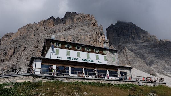 Dopo circa 400 metri di salita, si raggiunge l'apprezzato rifugio Auronzo, incorniciato dall'imponente parete nord delle Tre Cime di Lavaredo, che offre piatti gustosi e una vista suggestiva sulle imponenti dolomiti circostanti e sulla più bassa Auronzo di Cadore.