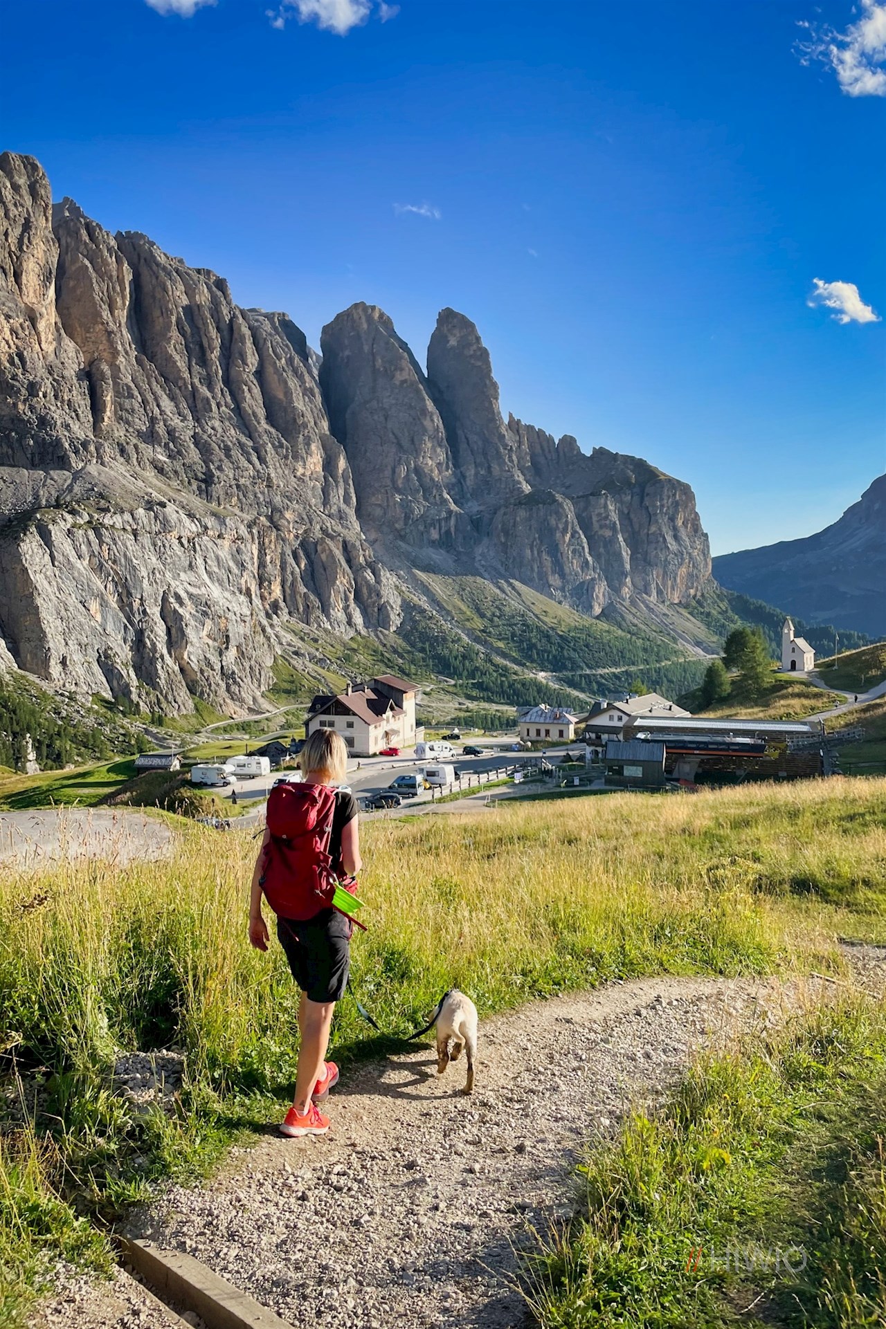 L'escursione alla baita Jimmy inizia dal passo Gardena, alto 2.120 m, che collega la Val Gardena con la Val Badia.