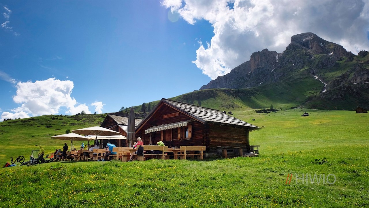 Con vista sulle montagne della Val Pusteria, l'invitante baita invita a fare una piacevole pausa prima che l'escursione salga un po' più ripidamente verso il passo di Göma.