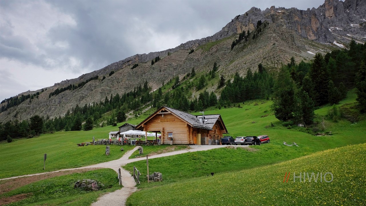 L'escursione panoramica alla baita Vaciara (Ütia Vaciara) inizia al parcheggio a pagamento del passo delle Erbe.
