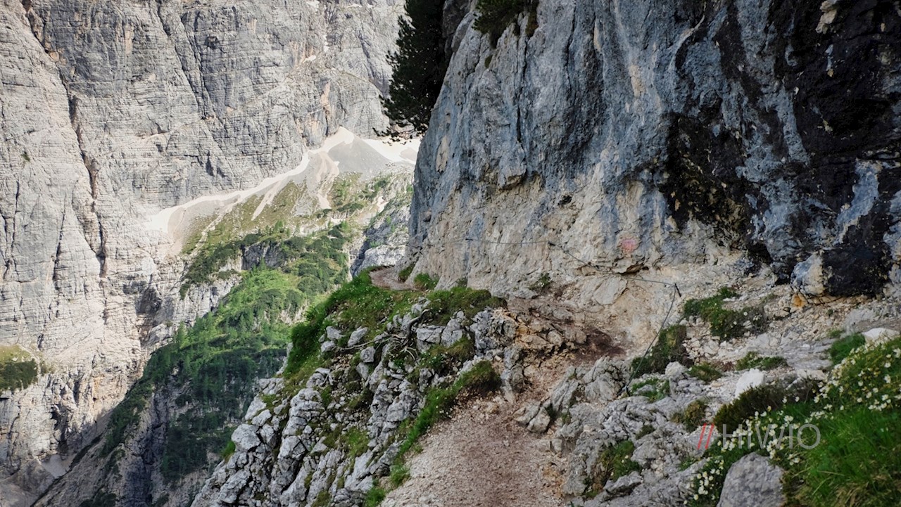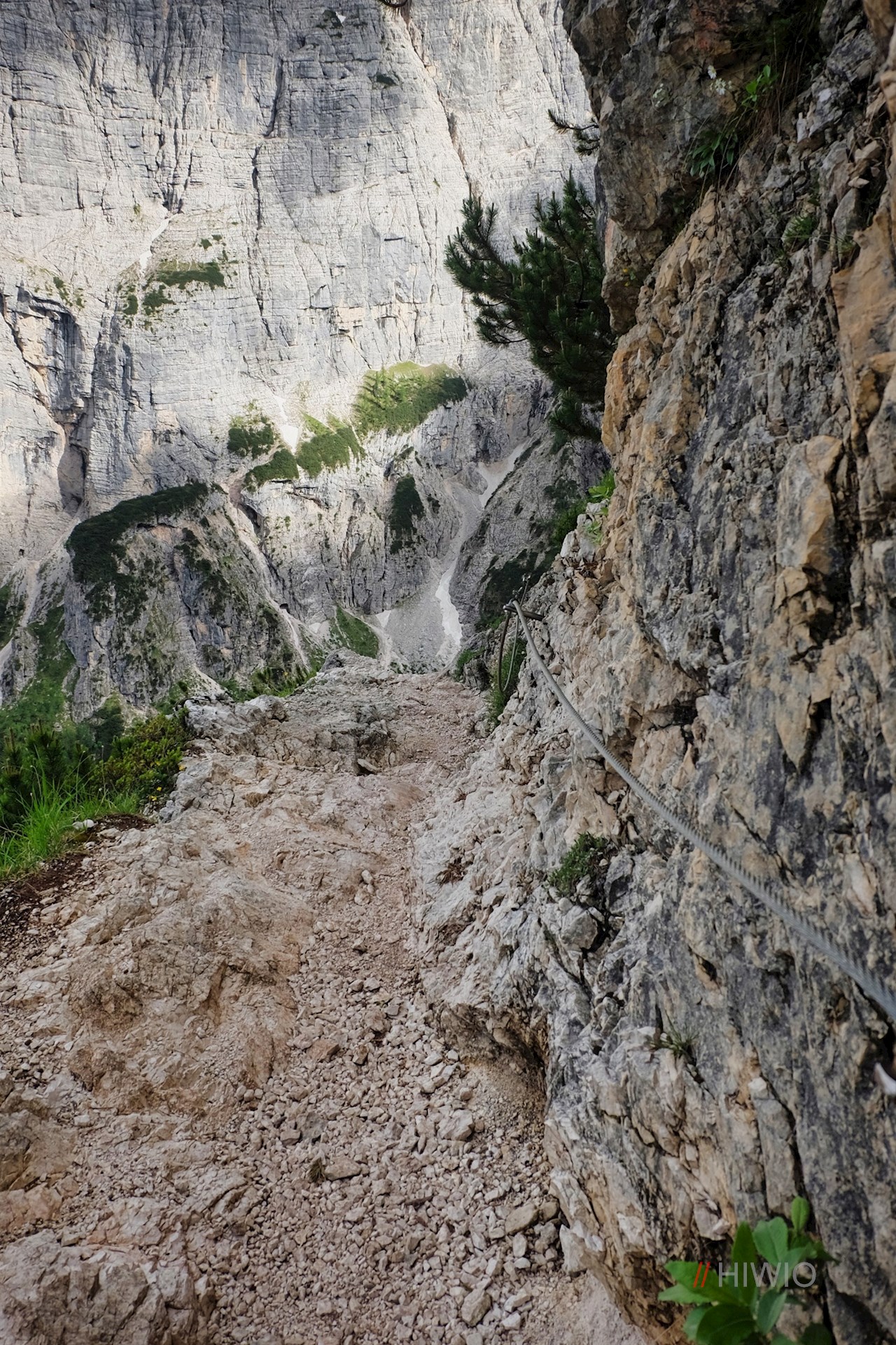 Sulla strada si incontrano alcuni passaggi esposti, ma sono fissati da corde e gradini di ferro. Passando quest'ultimi, il sentiero si snoda nuovamente in direzione del rifugio Vandelli a 1.930m di altitudine. Il favoloso lago di Sorapis, illuminato di un blu turchese, non è lontano dalla capanna. Circondato da dolci pascoli alpini e dalle aspre rocce del gruppo di Sorapis, è oggettivamente uno dei laghi più belli delle Dolomiti. Il suo caratteristico colore blu turchese è dovuto anche all'elevato contenuto di calcare.