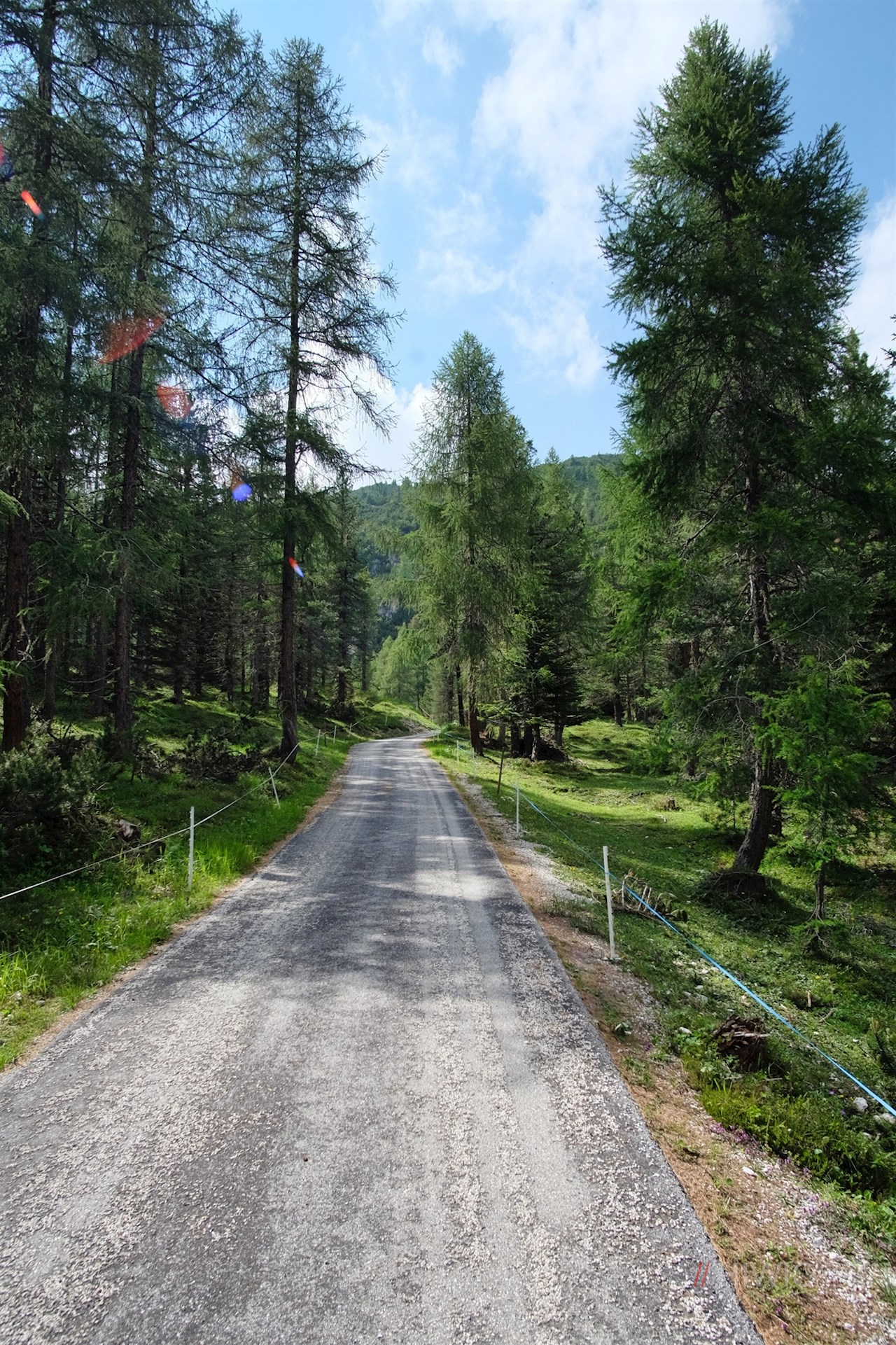 Attraversa il bosco in piacevole salita e si trasforma infine in una vecchia strada militare asfaltata. Si inerpica con numerose serpentine fino all'invitante rifugio Monte Piana A. Bosi e si apre su panorami di straordinaria bellezza sulle Tre cime di Lavaredo e sui Cadini di Misurina.
