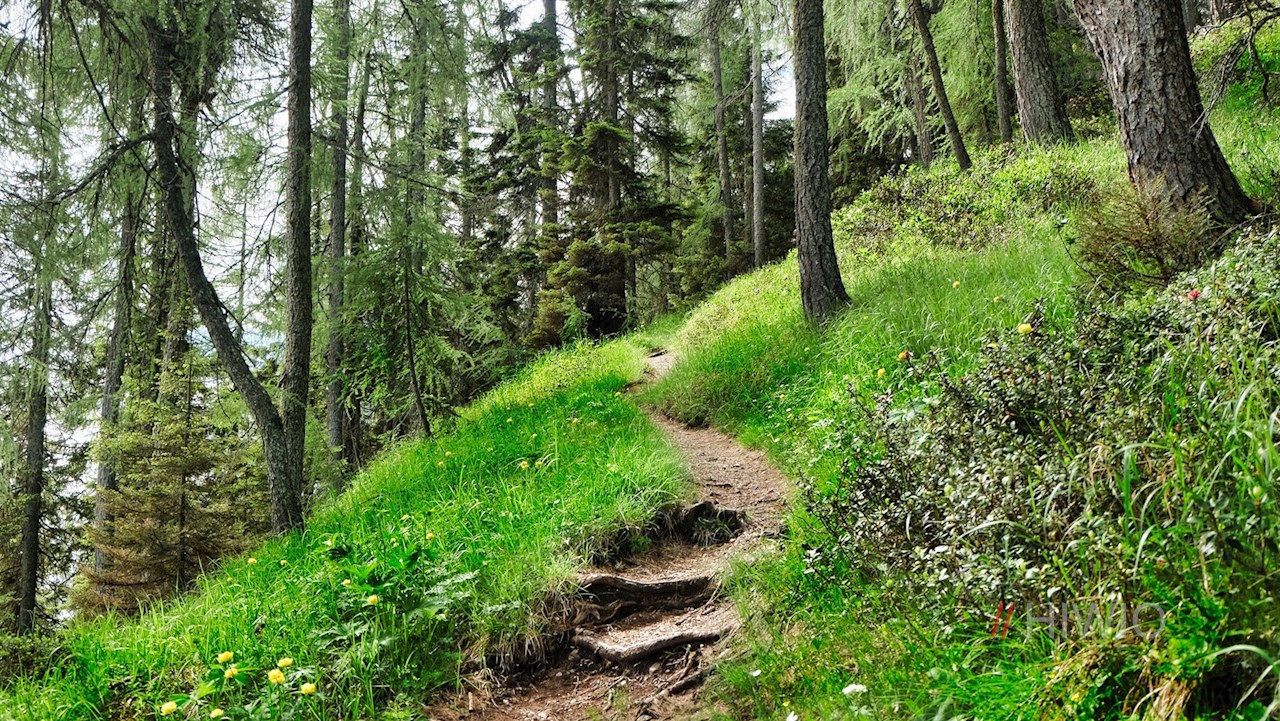 Questo sentiero forestale inizialmente largo e pianeggiante si trasforma ben presto in uno più stretto e piuttosto ripido.