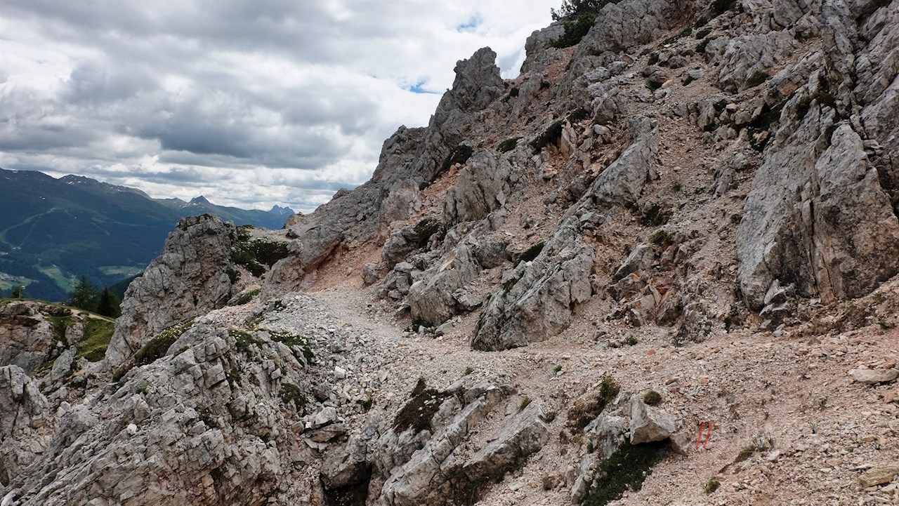 Gli escursionisti meno sicuri o non privi di vertigini dovrebbero terminare qui la salita e godere della magnifica vista su San Candido. Infatti gli ultimi metri, vicino al pendio, conducono su un sentiero molto stretto e ripido, ghiaioso e roccioso.