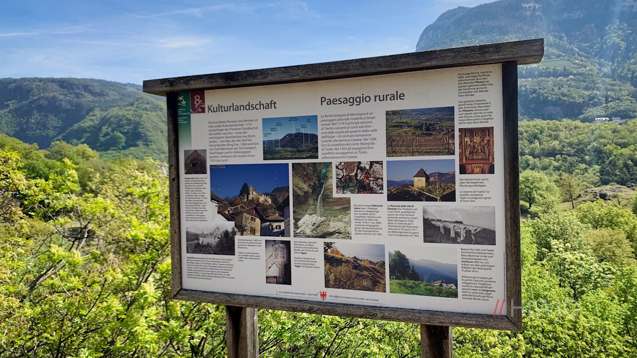 Lungo il sentiero, dodici pannelli informativi ricchi di immagini offrono interessanti spunti di riflessione sulla storia mutevole e sul paesaggio naturale e culturale della dorsale porfirica di Castelfeder.
