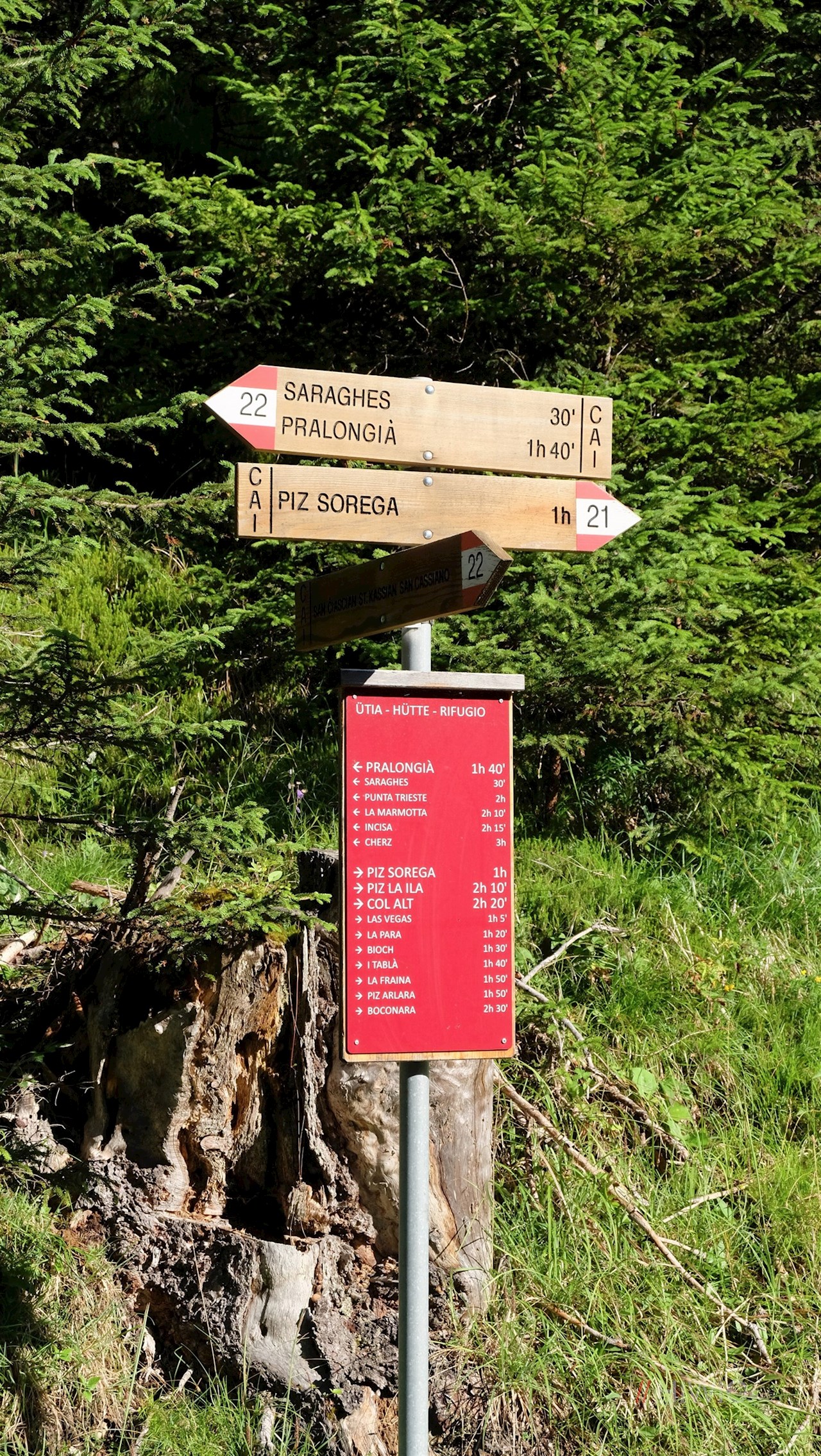 Seguendo l'ampio sentiero n. 22, circondato da boschi e prati, si percorre dapprima una piacevole salita fino alla popolare baita Saraghes. Davanti al pittoresco scenario del gruppo di Fanes, del La Varella, del Lagazuoi e del Setsas invita a fare una piacevole pausa dopo circa un'ora di cammino.