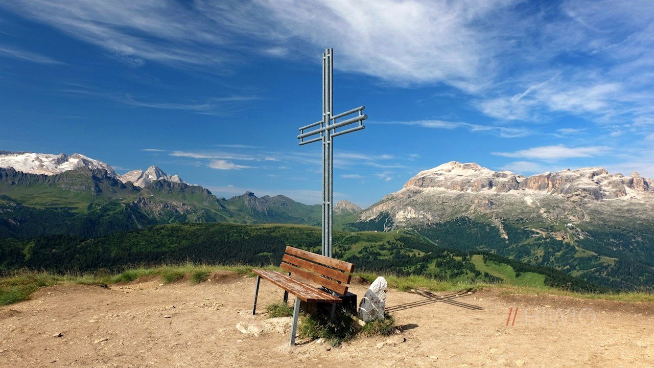 Poco dopo, lo Störes offre una vista mozzafiato sulla Marmolada, il massiccio del Sella, il Sassongher, il gruppo di Fanes, il Setsas e il Col di Lana. Una panchina panoramica invita a soffermarsi e a godersi questo idillio pittoresco.