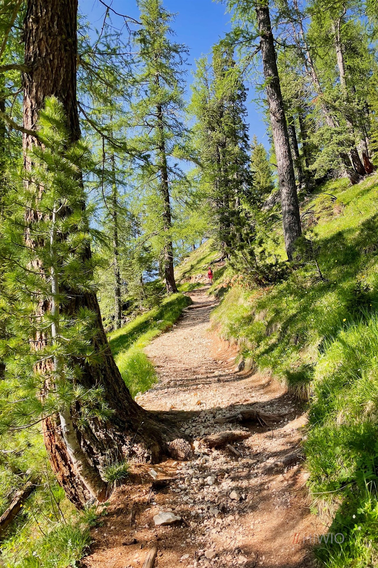 Uno stretto sentiero lungolago conduce intorno a questo gioiello scintillante, dove il lago e le montagne che vi si riflettono possono essere visti da prospettive sempre nuove.