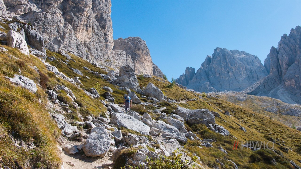 Dietro il limite del bosco, il sentiero si snoda in una salita più dolce lungo lo sperone roccioso dei Cadini di Misurina fino al rifugio Fonda Savio.
