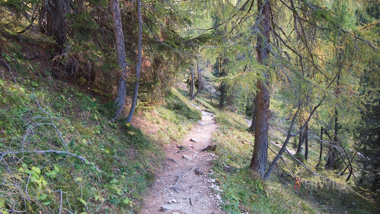 Seguendo il segnavia n. 115 in direzione del rifugio Fonda Savio, il sentiero sale inizialmente in modo costante sui pendii ricoperti di larici.