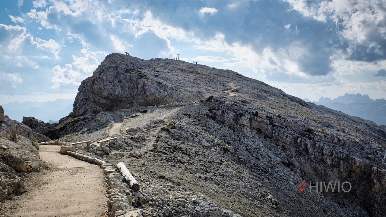 Prima di concedersi una meritata pausa, però, è consigliabile salire alla vicina croce di vetta del Lagazuoi, alla quale conducono sia l'ampio sentiero escursionistico che si dirama a sinistra sia il sentiero che si dirama a destra e che portano alla croce di vetta con una camminata di circa dieci minuti. Accanto alla graziosa croce di legno, si può ammirare quasi tutte le dolomiti, dalla vicina cima Conturines e dalle Tofane fino alla Marmolada e alle filigrane Odle di Funes.