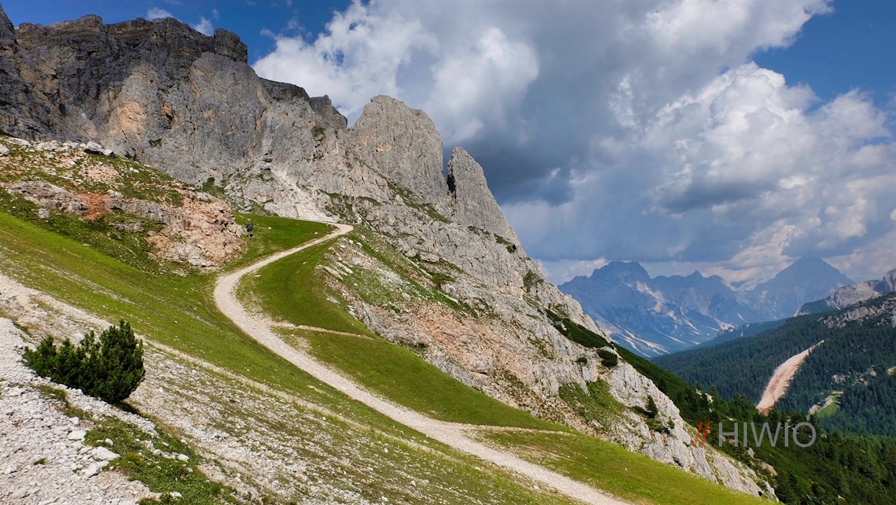 Sulla forcella a 2.507 m il sentiero escursionistico n. 401 si dirama a sinistra. Con l'imponente Tofana di Rozes alle spalle, attraversa dapprima i pendii ghiaiosi e ghiaiosi in leggera salita e poi sale con numerose serpentine fino al rifugio Lagazuoi. Lungo il percorso si passa accanto a un'ex caserma degli ufficiali e a diversi posti di guardia dei Kaiserjäger, che ricordano la crudele guerra di montagna della prima guerra mondiale.