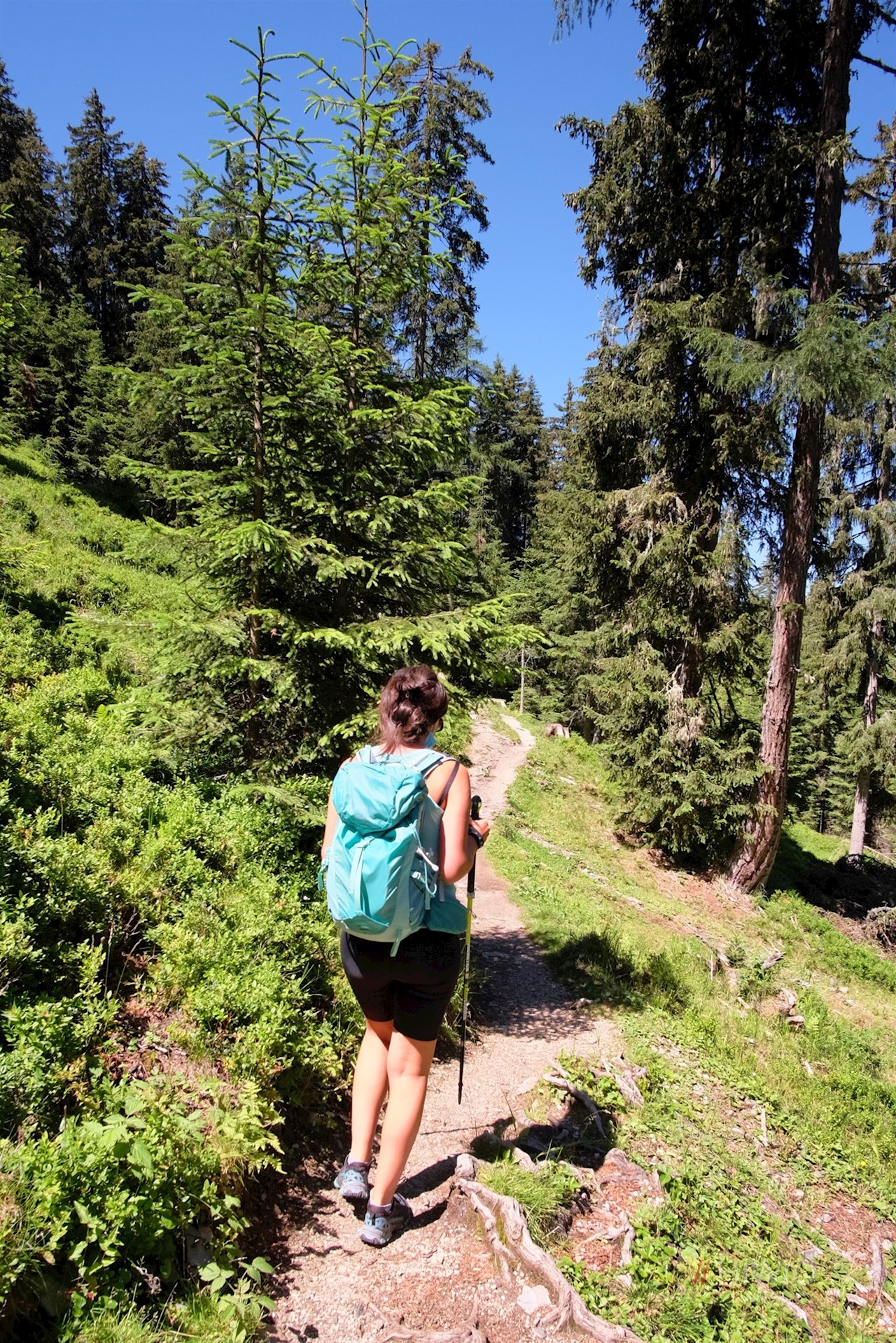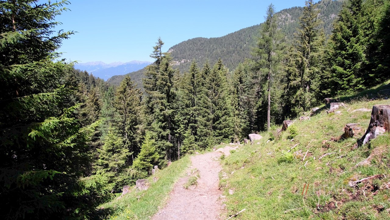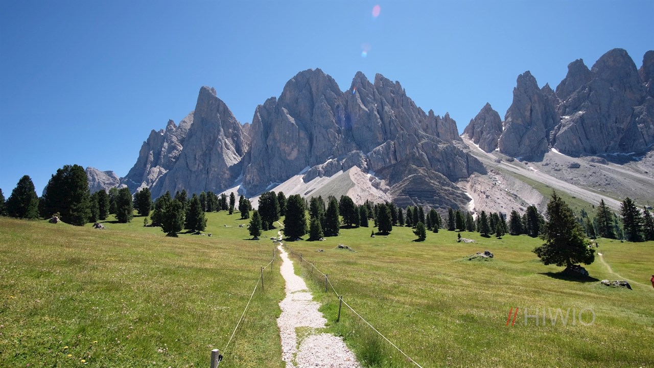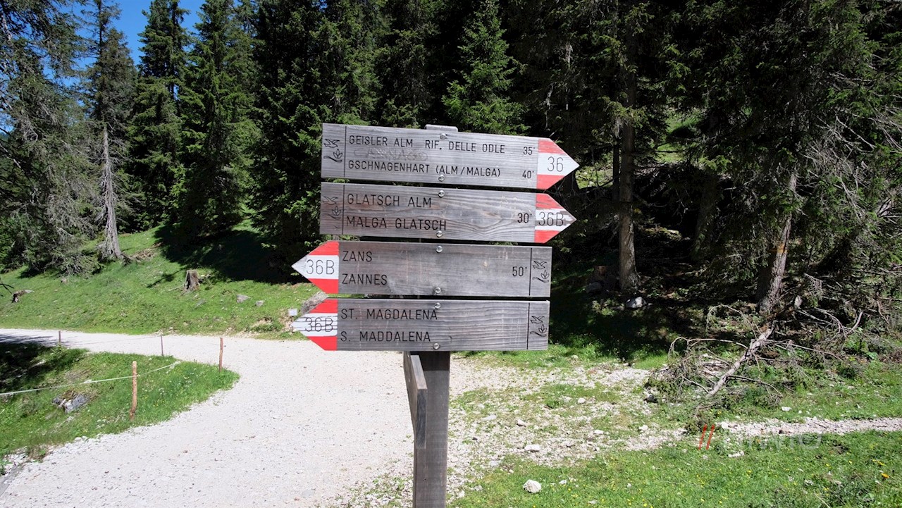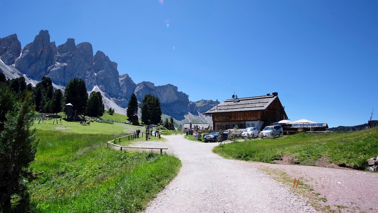 Seguendo il sentiero numero 36 in direzione del rifugio delle Odle (Geisler Alm), il sentiero, inizialmente largo, entra subito in un bosco, attraverso il quale scende leggermente. Poco dopo, si trasforma in uno stretto sentiero forestale. Conduce in una piacevole salita alla rustica Dusler Alm, ai piedi del Sass Rigais. A circa metà percorso, invita a fare una comoda pausa.