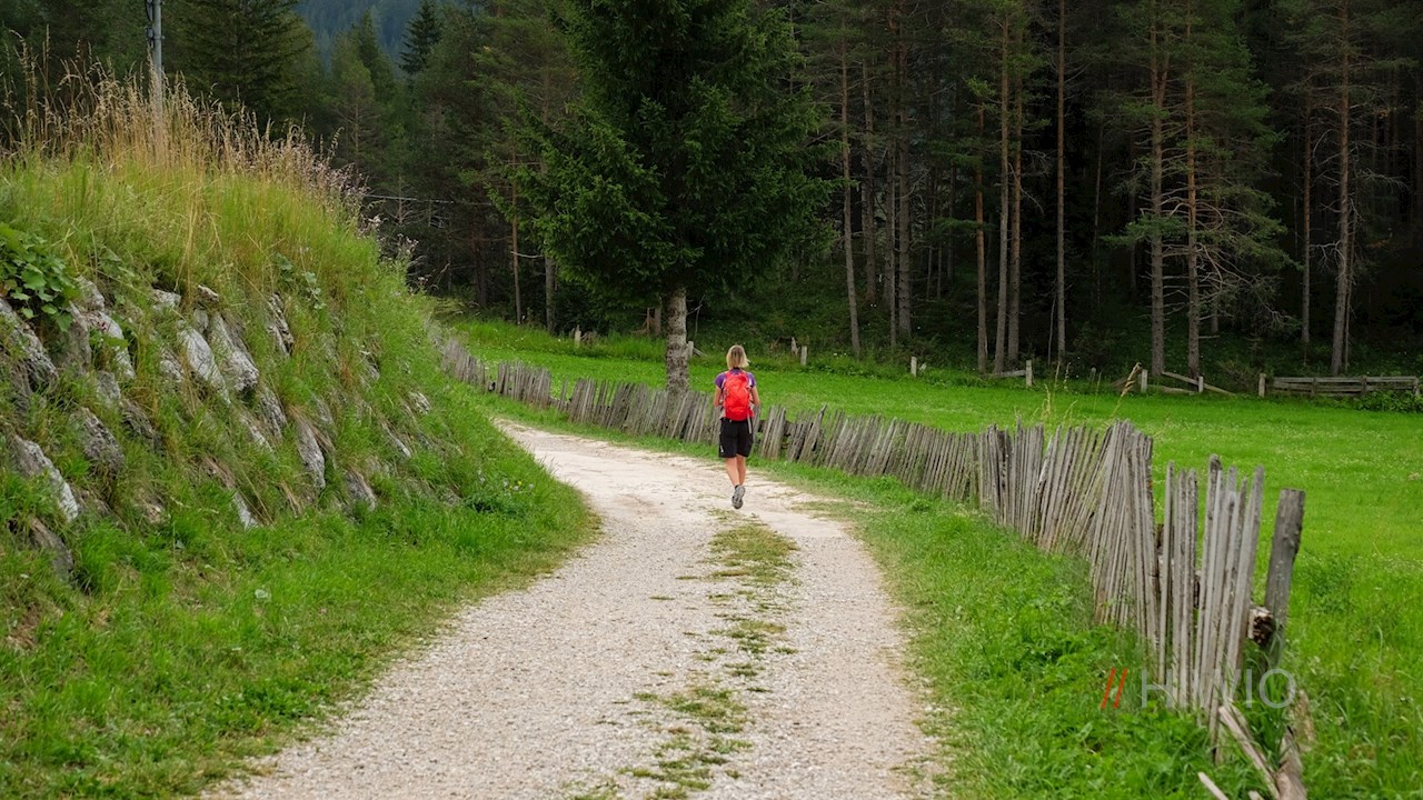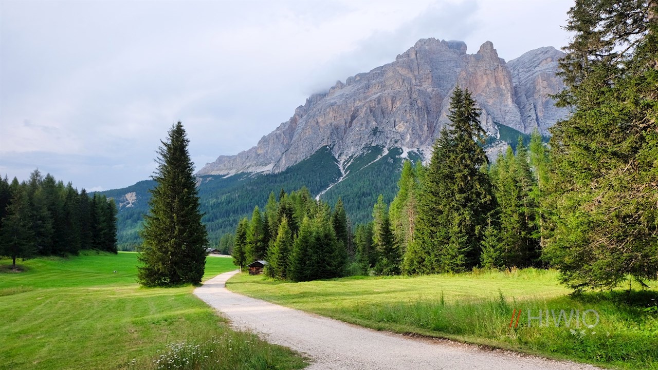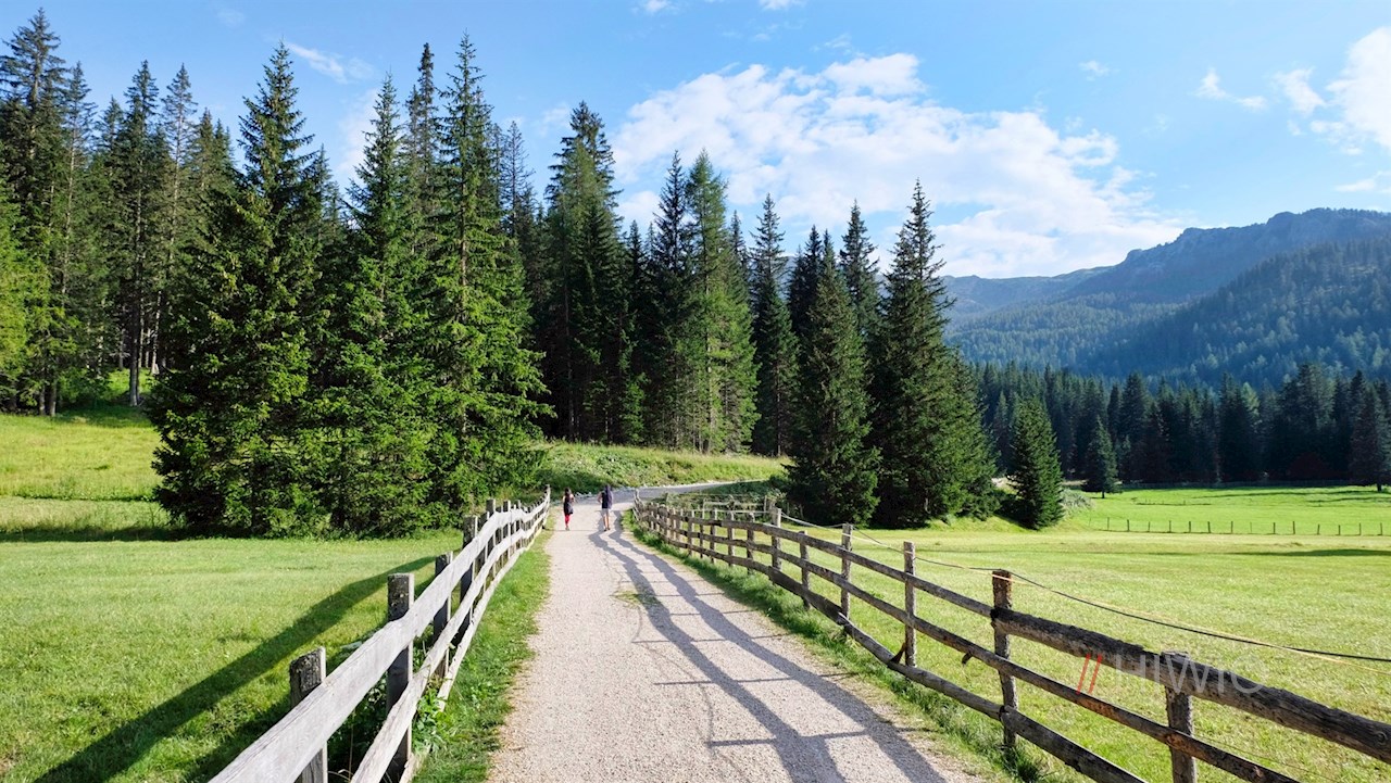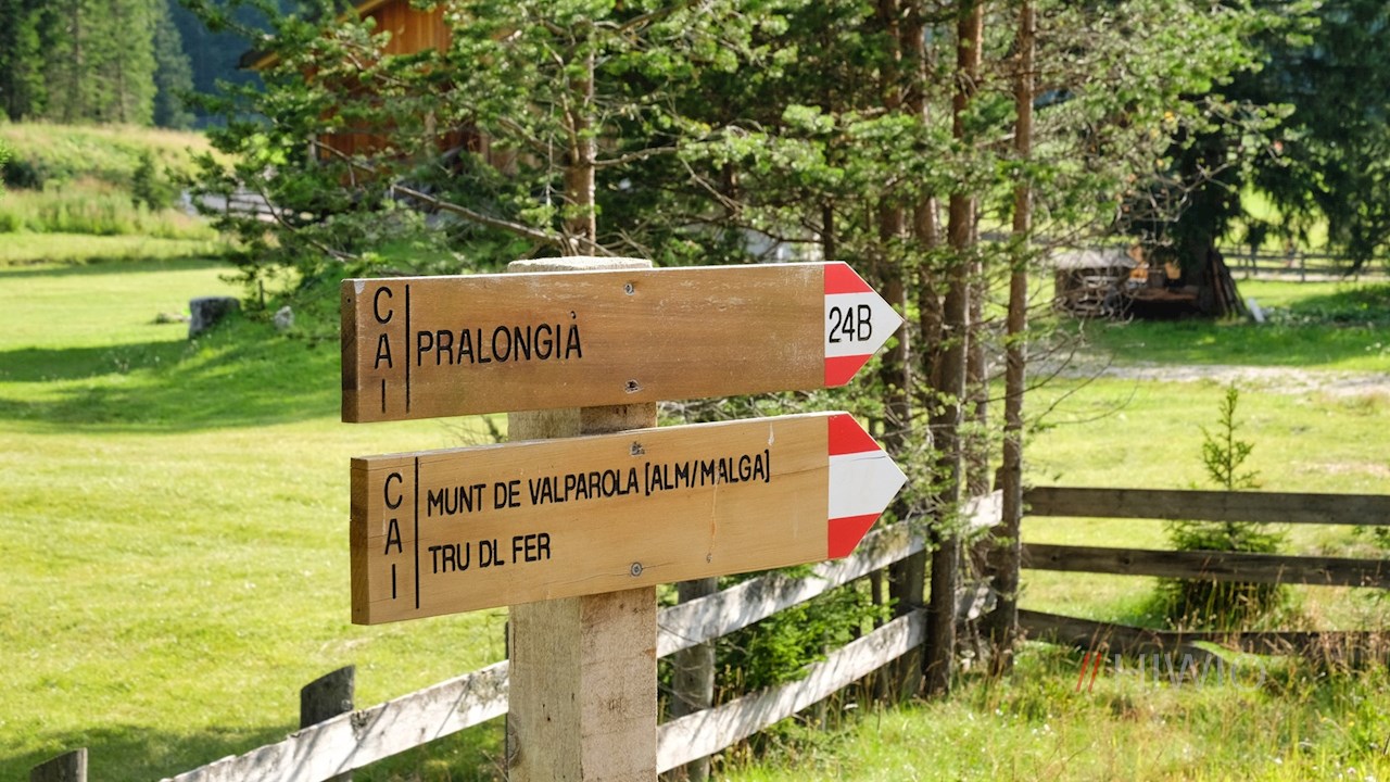Sul lato opposto della strada, l'ampio sentiero escursionistico n. 24B si dirama in direzione Pralongia. Con le imponenti pareti rocciose della Varella e della cima Conturines alle spalle, si snoda quasi in piano attraverso i prati alberati.
