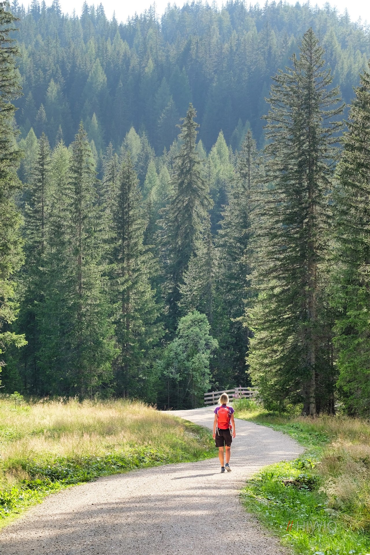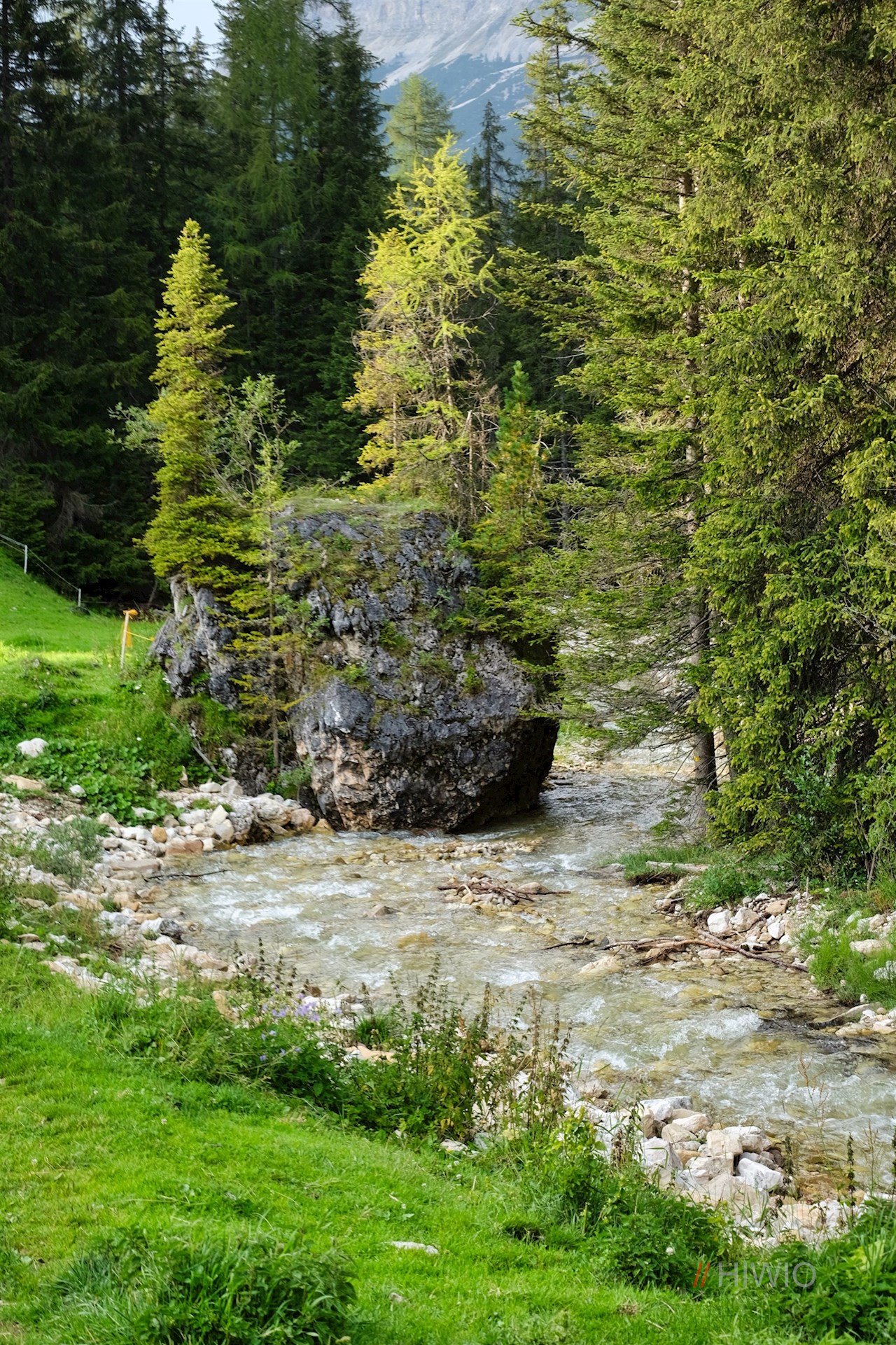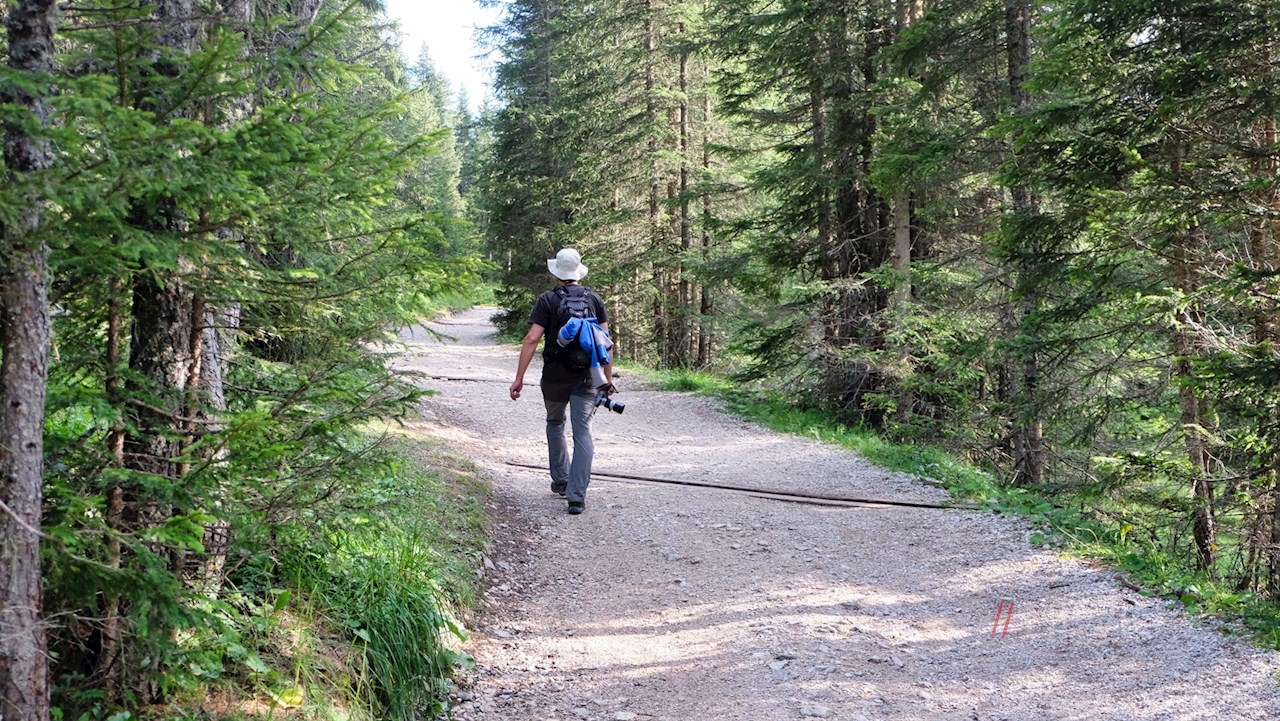 Sul lato opposto della strada, l'ampio sentiero escursionistico n. 24B si dirama in direzione Pralongia. Con le imponenti pareti rocciose della Varella e della cima Conturines alle spalle, si snoda quasi in piano attraverso i prati alberati.