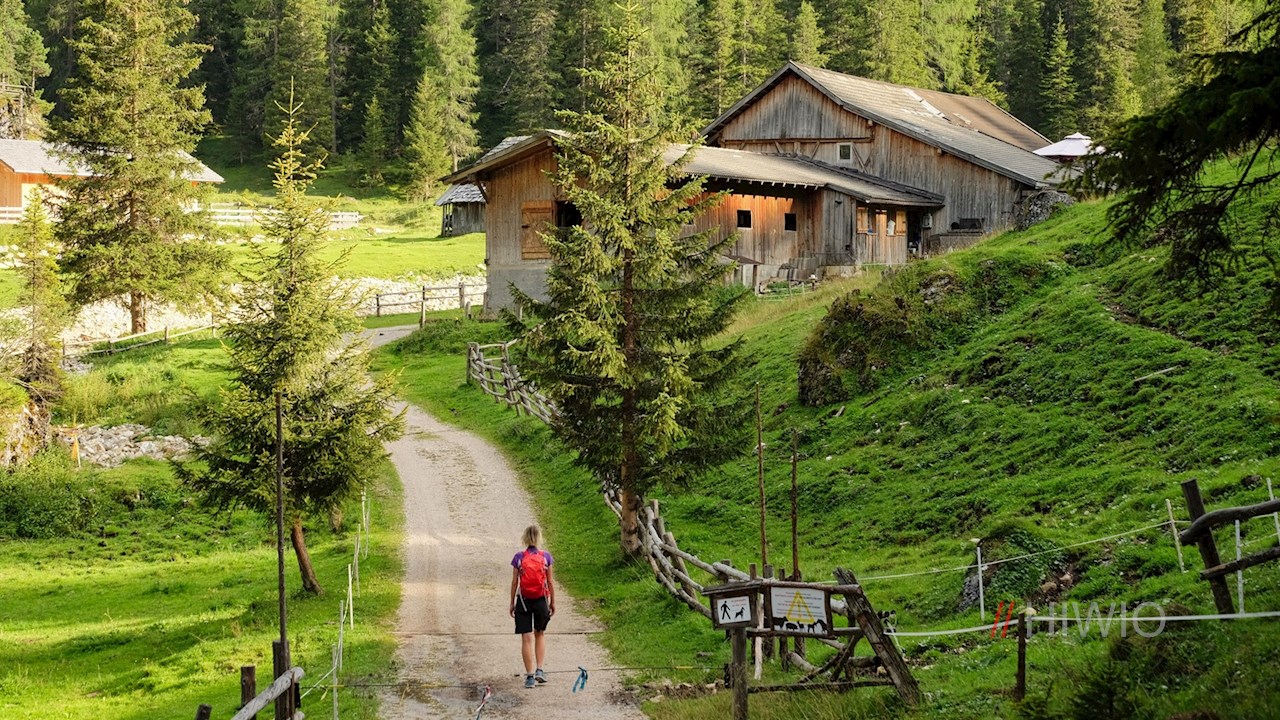 Dopo aver attraversato il piccolo torrente Rü de Col dai Furns, si segue il sentiero n. 18, che si dirama a sinistra verso la die malga di Valparola (Munt de Valparola). Il sentiero conduce a questa idilliaca malga ai piedi del passo Valparola e del Setsas, dove gli escursionisti possono trascorrere momenti di piacere in un'atmosfera accogliente. Oltre ai piatti tradizionali, il menu della malga Valparola comprende anche pane fatto in casa, formaggio, yogurt, speck e ricotta.