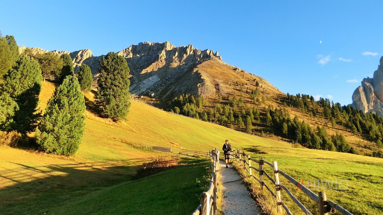 Dietro il confine del bosco, si aprono i vasti prati di Gampen, incorniciati dalle Odle di Funes. Sullo sfondo del Col di Poma (Zendleser Kofel), il sentiero conduce ora, con una salita un po' più ripida, alla malga Gampen, sulla cui terrazza soleggiata si possono gustare non solo i piatti preparati con cura, ma anche la splendida vista sulla val di Funes.