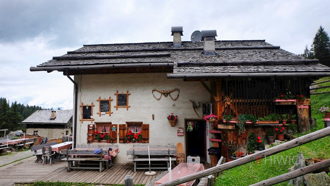 Dopo tre quarti d'ora di cammino, l'accogliente malga Glatsch, circondata da prati, pini cembri e abeti rossi, invita a fare una piacevole pausa di fronte all'incantevole sfondo delle Odle della val di Funes.