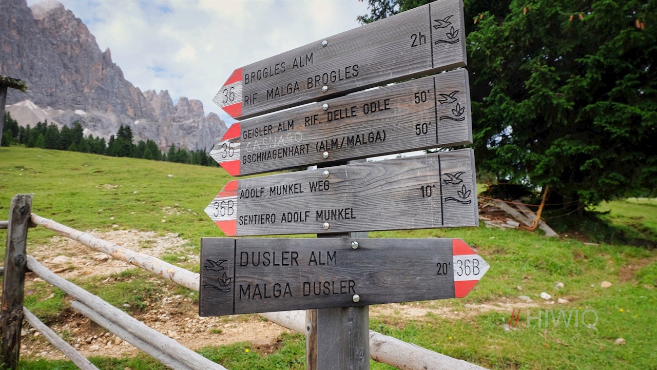 Dalla malga Dusler, il sentiero n. 36, in leggera pendenza, riporta al punto di partenza a Zannes.