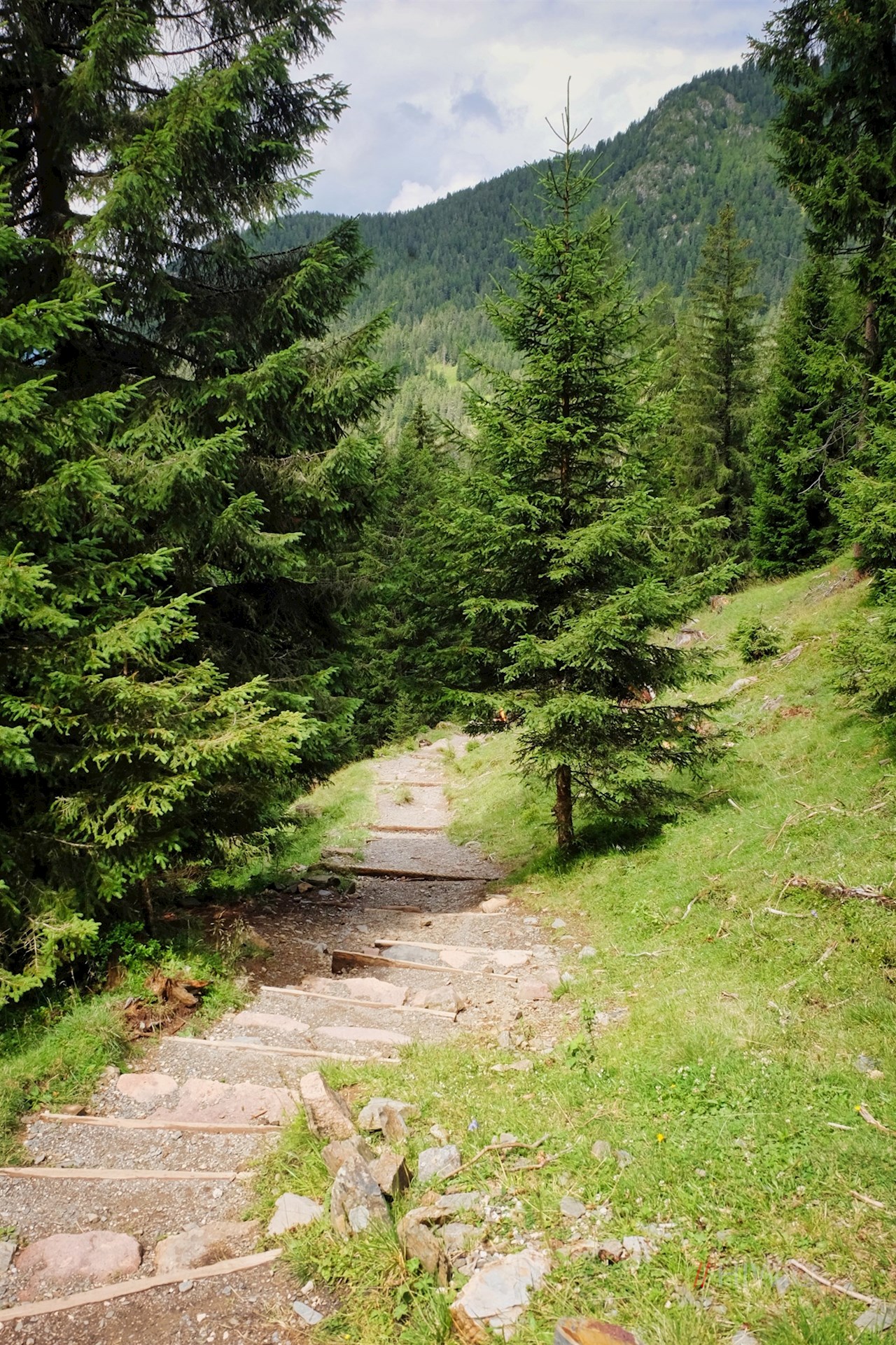 Dal parcheggio a pagamento si diparte l'ampio sentiero forestale n. 36 in direzione della malga Glatsch, che si snoda attraverso il bosco in leggera salita.