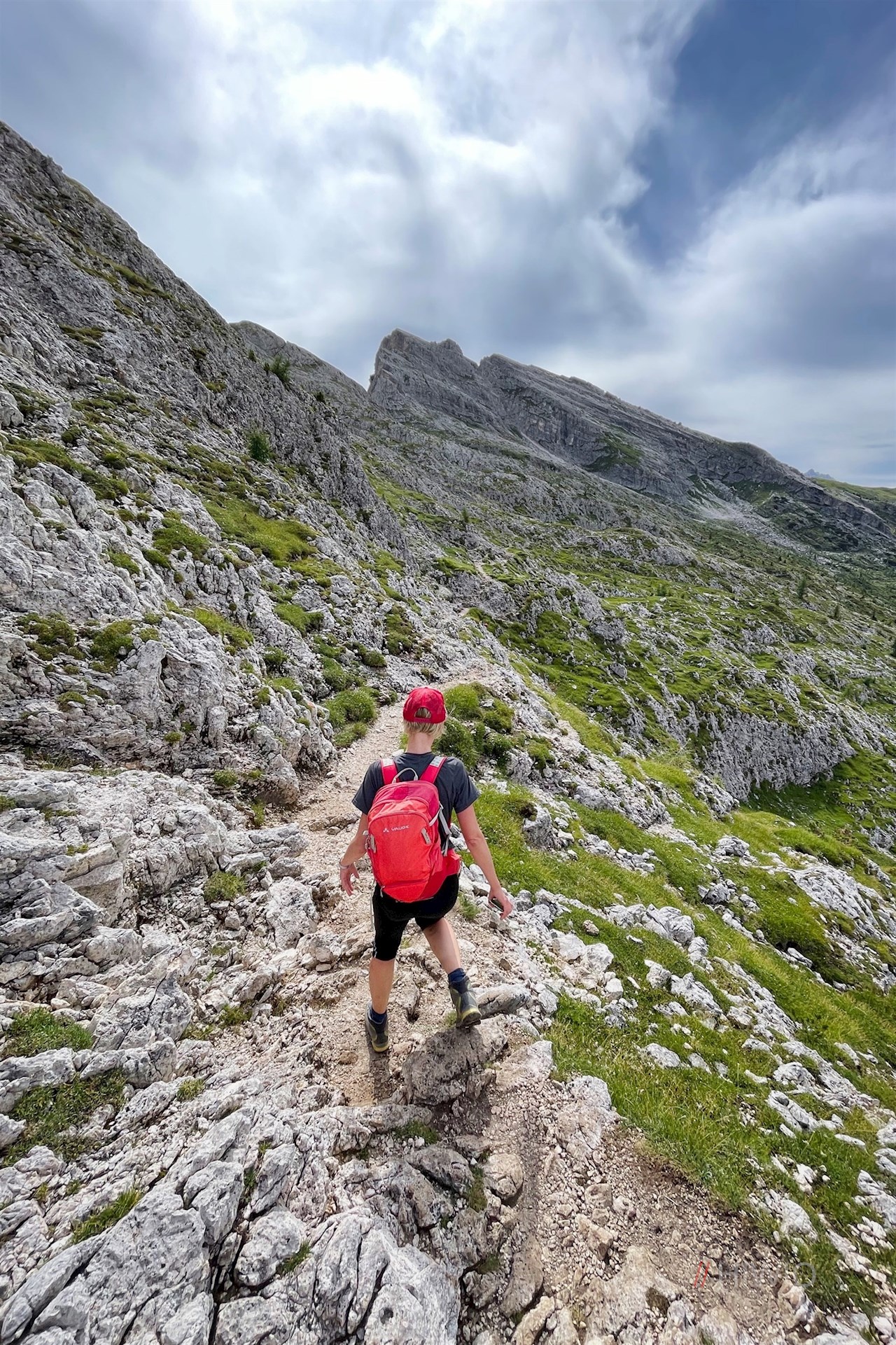 Infine, la salita al Settsass si dirama sul lato sinistro del sentiero. Ma noi continuiamo a seguire il sentiero verso Pralongia, che ora si snoda attraverso pittoreschi prati alpini ricoperti di innumerevoli fiori nella bella stagione, fino allo Störes.
