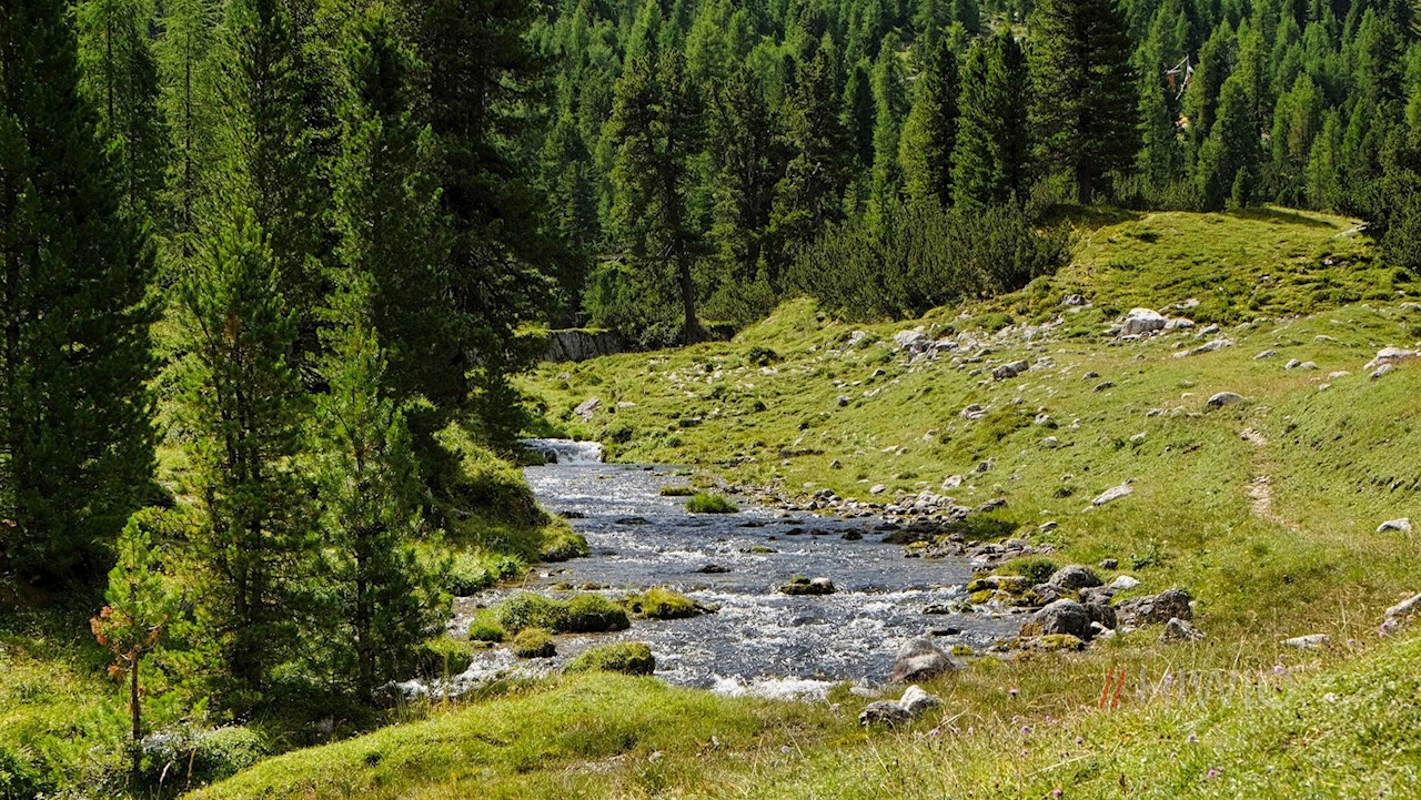 A un grande incrocio, i due sentieri si uniscono. Ora i pittoreschi prati alpini di Fanes, attraversati da ruscelli gorgoglianti, non sono lontani.