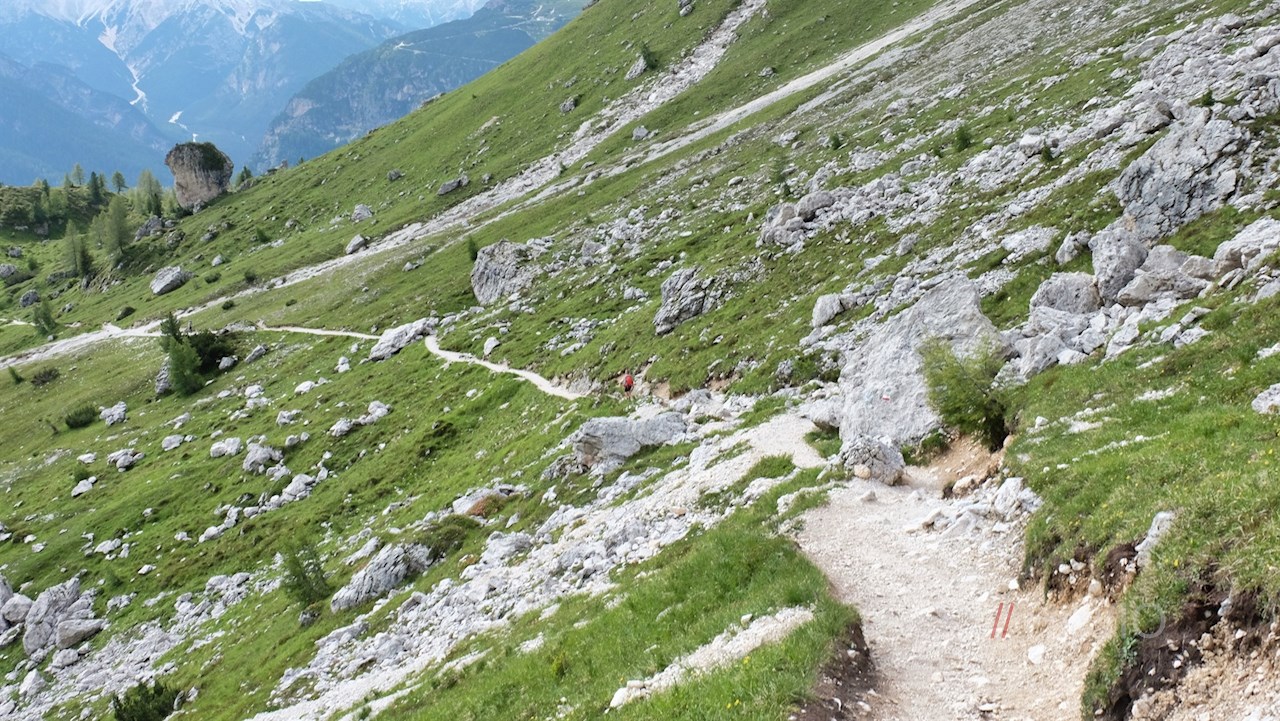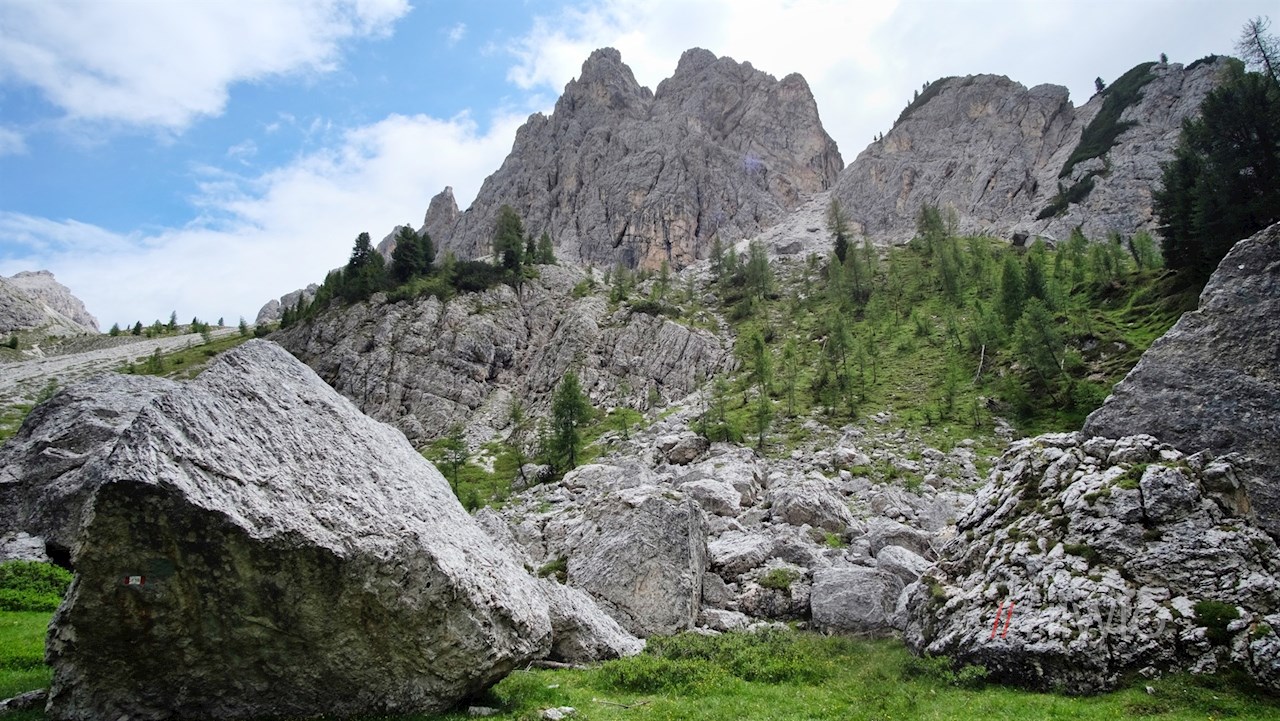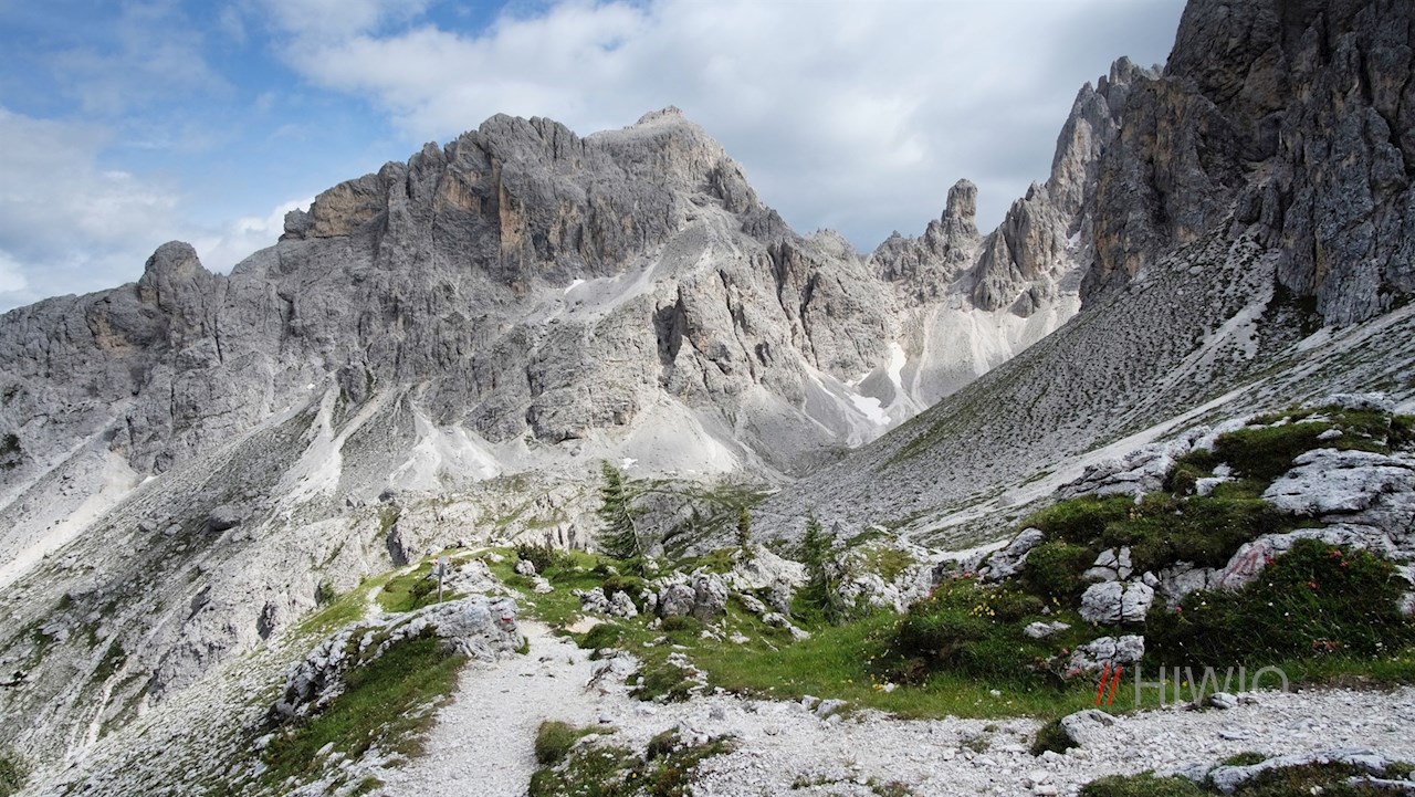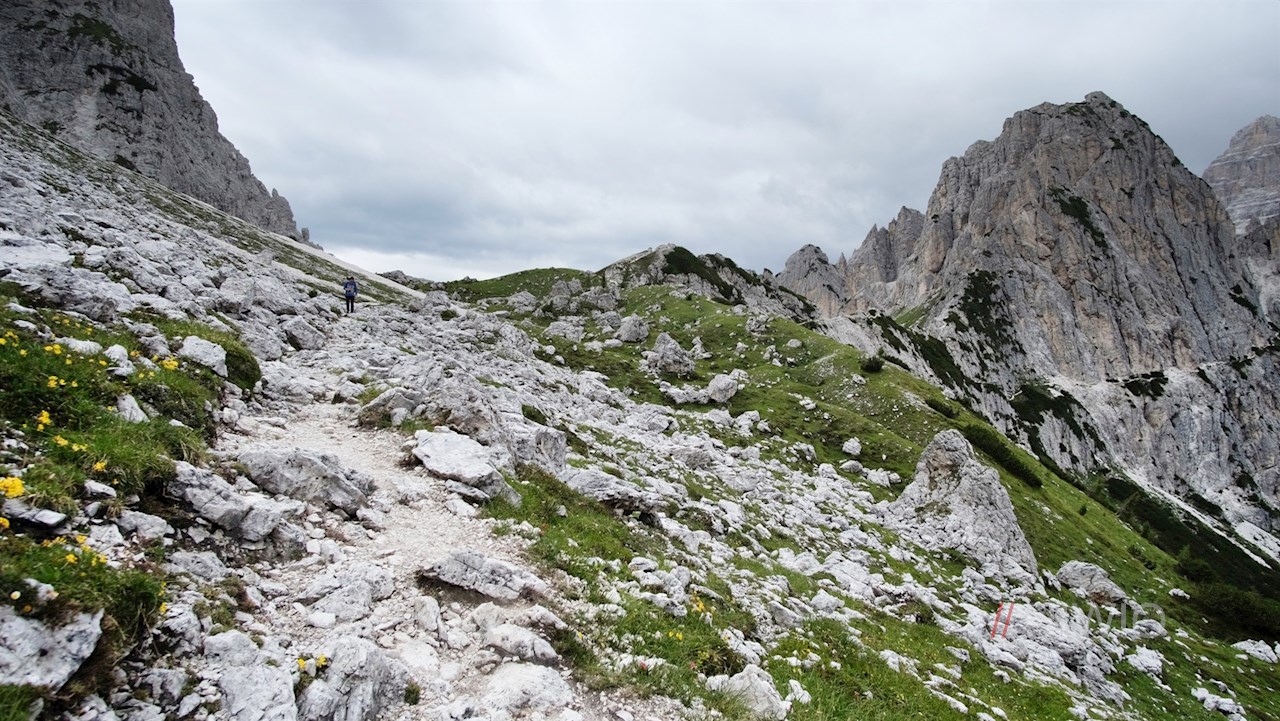 Alla forcella Rinbianco si imbocca il sentiero 117 che, incorniciato da imponenti pareti rocciose, sale dolcemente sul terreno ghiaioso e scosceso, aprendo bellissime vedute sul versante meridionale, piuttosto sconosciuto, delle famosissime Tre cime di Lavaredo.