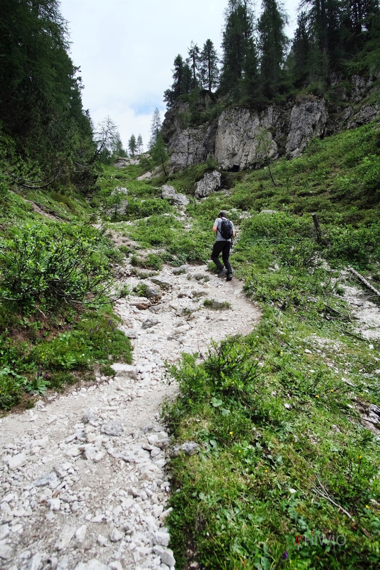 Dapprima sale dolcemente nel bosco e infine entra in un canalone roccioso ricco di massi e ghiaia, attraverso il quale sale un po' più ripidamente. Alle spalle si estendono prati montani rocciosi, sassosi e ghiaiosi, incorniciati da alte pareti dolomitiche, attraverso i quali il sentiero sale alla forcella Rinbianco. A 2.175 m di altitudine, qui si apre una vista imponente su mointi delle Tre cime che svettano tutt'intorno, con la cima Grande, la cima Piccola e il monte Paterno.