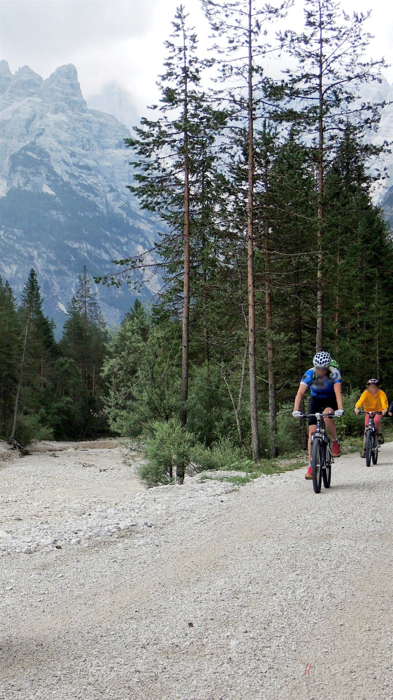 Si parte dalla stazione di Dobbiaco in direzione ovest e già dopo 200 metri, all'altezza della stazione dei Carabinieri, si devia a sinistra sulla pista ciclabile in direzione della valle di Landro. Dalla Nordic Arena, dove in inverno si svolgono regolarmente le gare di coppa del mondo di sci di fondo, ci si inoltra nella valle su una strada sterrata larga e in leggera salita. La pista ciclabile corre parallela al fiume cristallino Rienza, il cui ruggito selvaggio è il nostro costante compagno di viaggio. Passiamo davanti al bellissimo lago di Dobbiaco e al cimitero di guerra. Poco dopo, una sosta con foto è quasi obbligatoria, perché le famose Tre Cime di Lavaredo si presentano dal loro lato più bello. Dopo il lago di Landro, con il Monte Cristallo sullo sfondo, mancano solo 4 chilometri alla meta della giornata: Cimabanche, che è anche il confine tra l'Alto Adige e il Veneto.