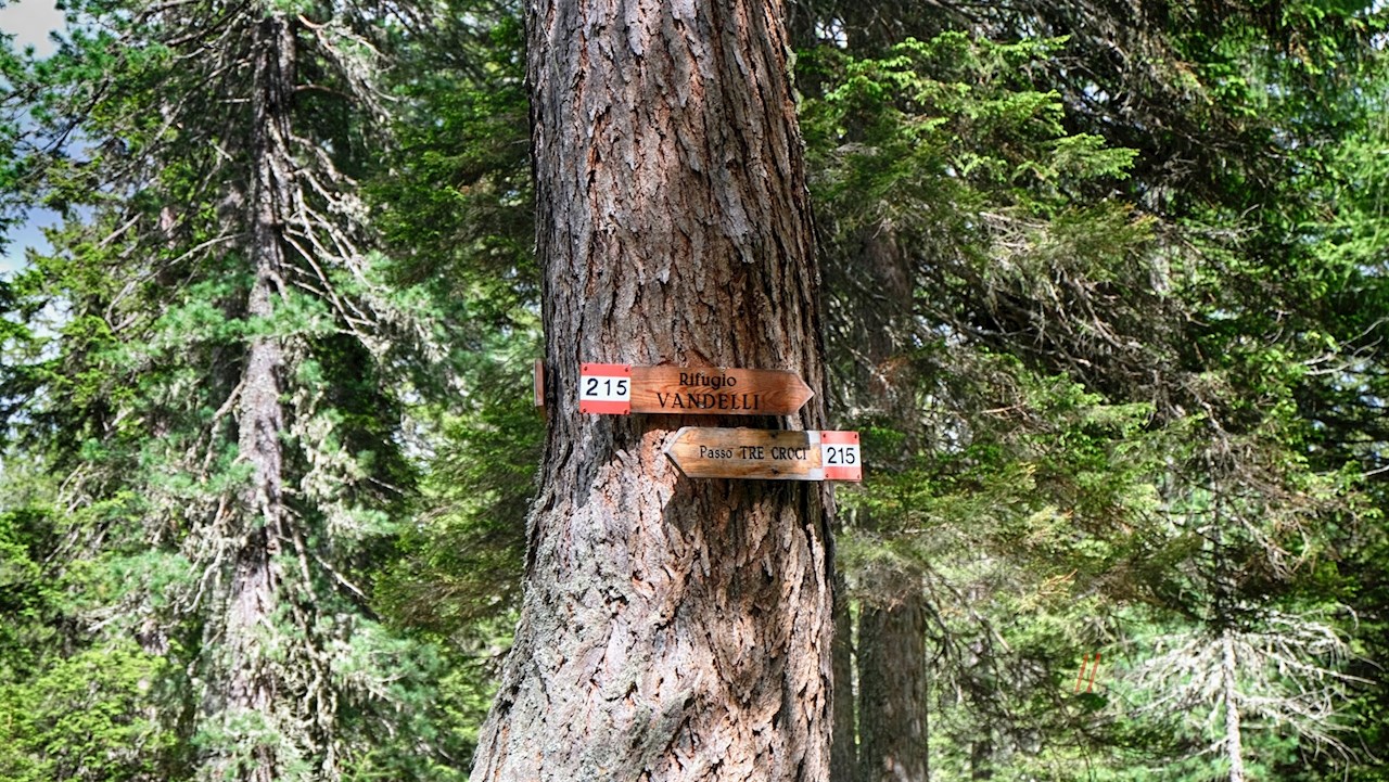 Dal Passo Tre Croci si prosegue per il sentiero 215 in direzione Rifugio Vandelli o Rifugio al Sorapis. All'inizio si snoda in modo quasi uniforme attraverso un bosco appartato, che di tanto in tanto offre una vista sulle Dolomiti Bellunesi circostanti.