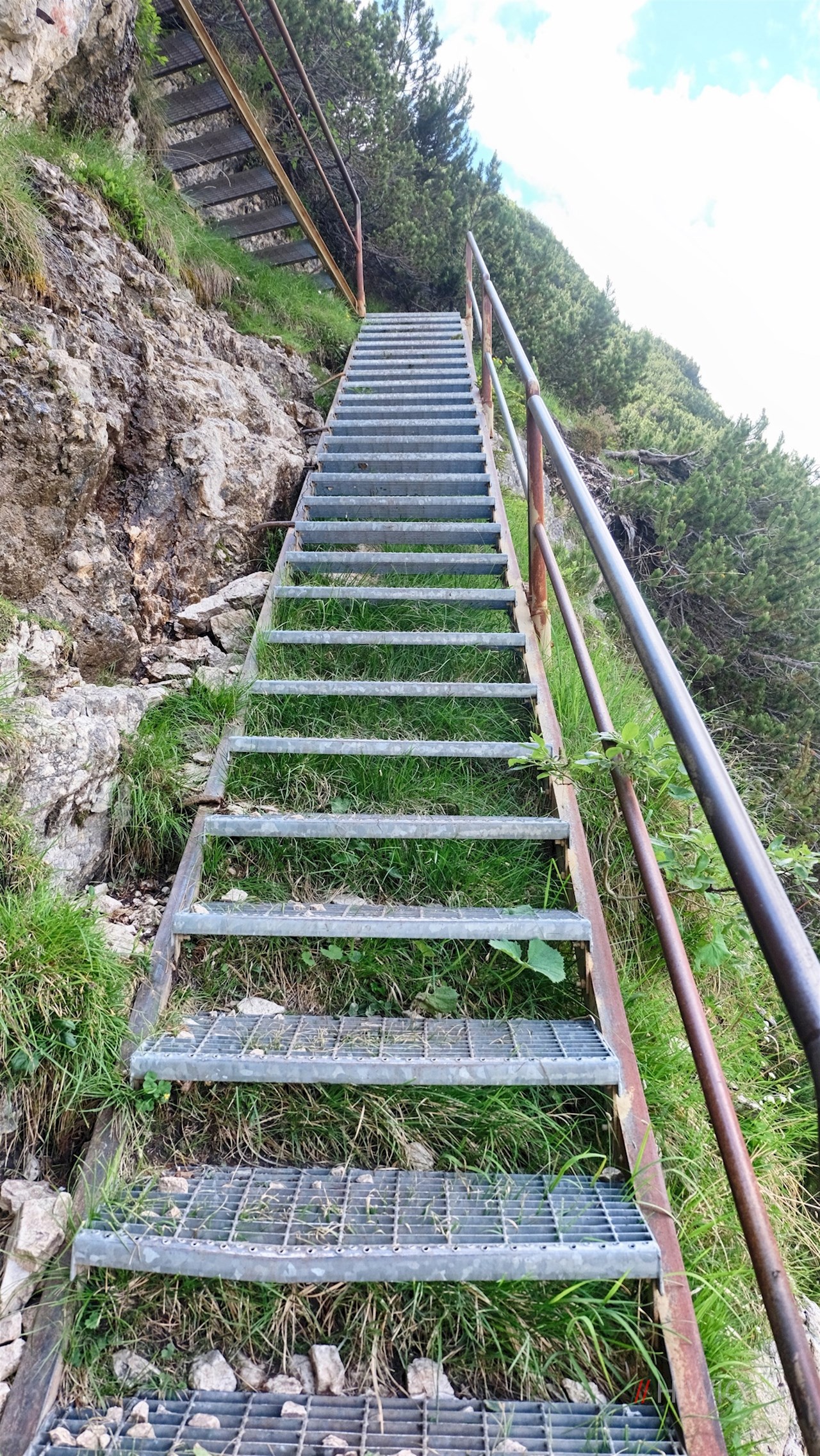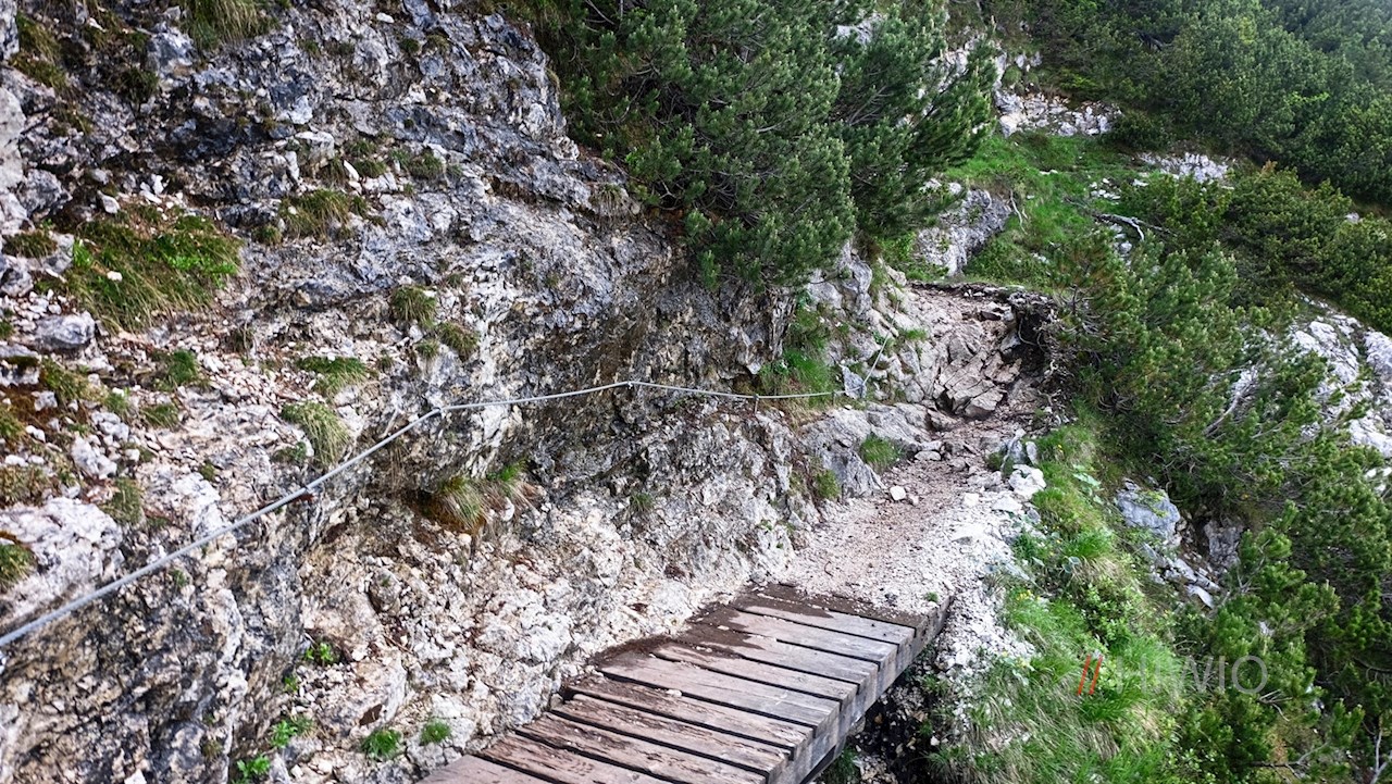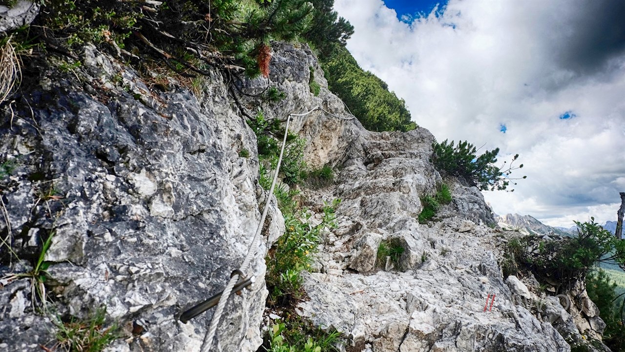 Presto si giunge ad alcuni passaggi esposti, che si sono attraversare in sicurezza grazie a delle funi d'acciaio e scalinate metalliche attaccate nelle rocce. Tuttavia, questo sentiero è consigliato agli escursionisti privi di vertigini e abituati a sentieri di montagna, visto che il sentiero è stretto e conduce attraverso una parete rocciosa accanto a un abisso profondo centinaia di metri.