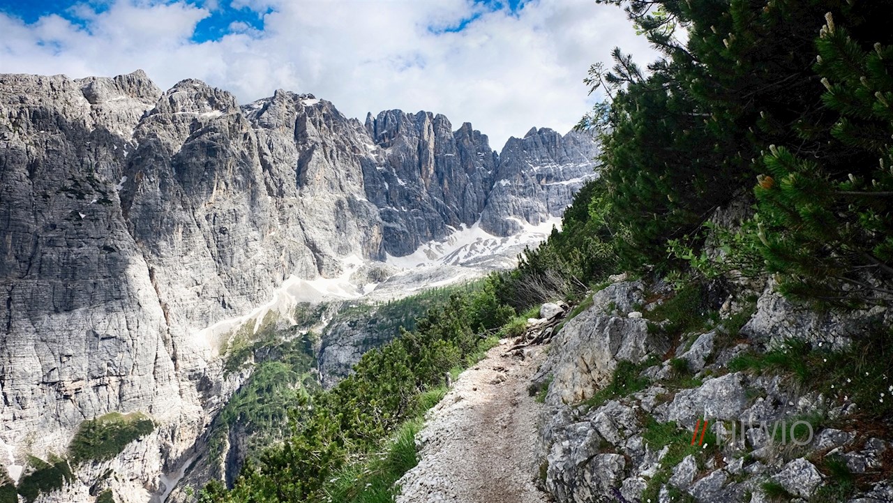 Infine il bosco si radura e il sentiero, finora abbastanza ampio, si fa via via più stretto e un po' più ripido, ma più interessante dal punto di vista paesaggistico: la vista spazia su fitte e profonde foreste a valle e alte e imponenti pareti rocciose. Anche i picchi distintivi delle Tre Cime di Lavaredo, famose in tutto il mondo, sono visibili in lontananza.