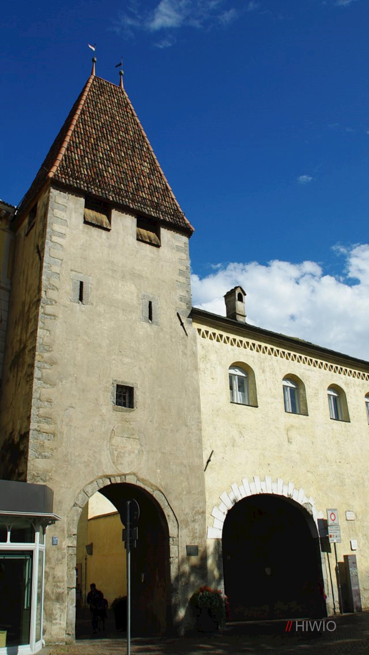 “Porta Croce“, più comunemente conosciuta come “Porta Sole“, prende il suo nome da via S. Croce, che in questo punto sboccava verso il centro storico. Questa via raccoglieva, per così dire, il traffico proveniente da Bolzano e, attraverso Porta Croce, lo convogliava in direzione Portici Minori e Maggiori e, attraverso Porta San Michele, in direzione Val Pusteria. Dunque, questa via prese il posto di via Roncato, arteria stradale principale di quei tempi. Porta Croce, probabilmente costruita nella prima metà del XIII secolo, nel corso dei secoli avrebbe subito diverse modifiche, delle quali la realizzazione di una porta parallela nel 1911, forse, fu la più importante. Questa porta fu necessaria, in quanto il traffico era aumentato notevolmente in seguito alla costruzione di via Stazione. Piccolo dettaglio marginale: pertanto si presume che, all’inizio del XVIII secolo la torre di Porta Croce fu ridotta di un piano e corredata di un timpano barocco, in modo da adeguare la sua linea allo stile di allestimento del Giardino dei Signori adiacente. La sua forma originaria sarebbe dovuta essere ripristinata nel 1910.