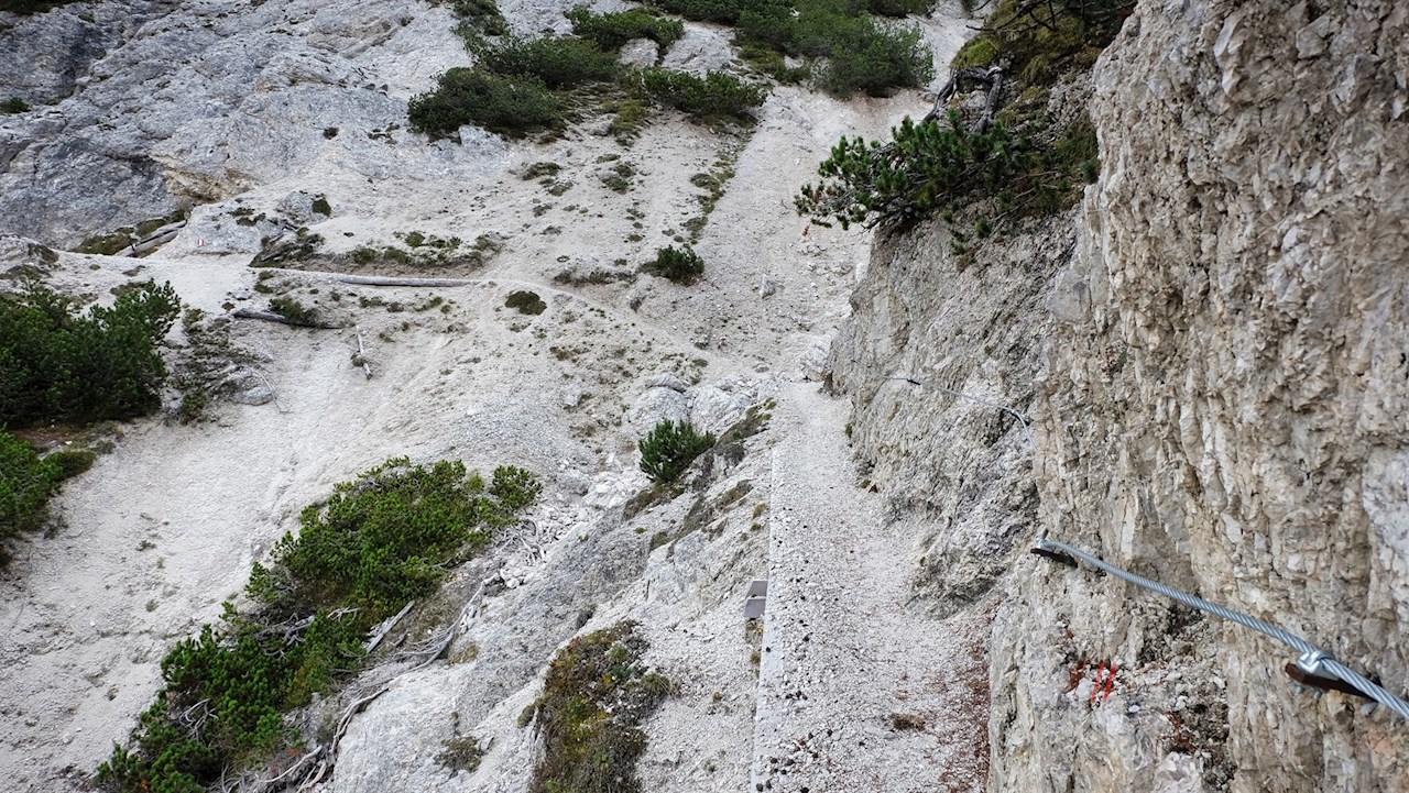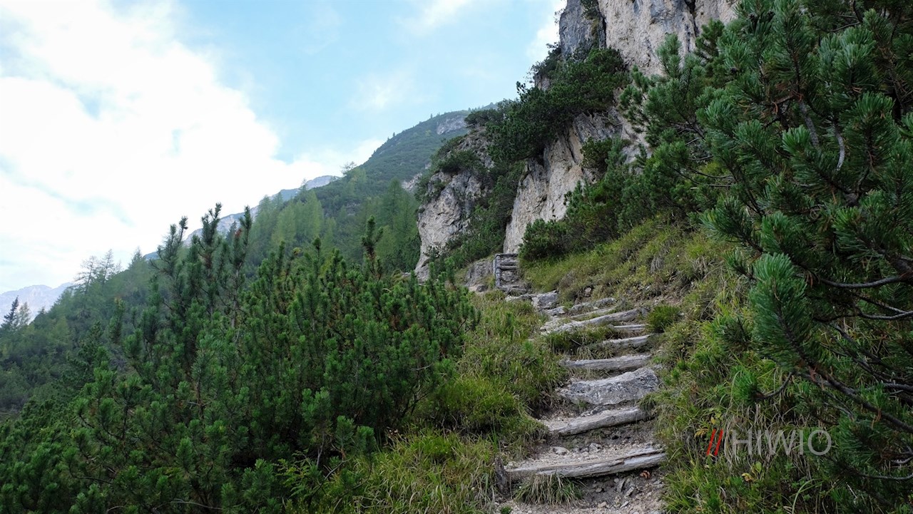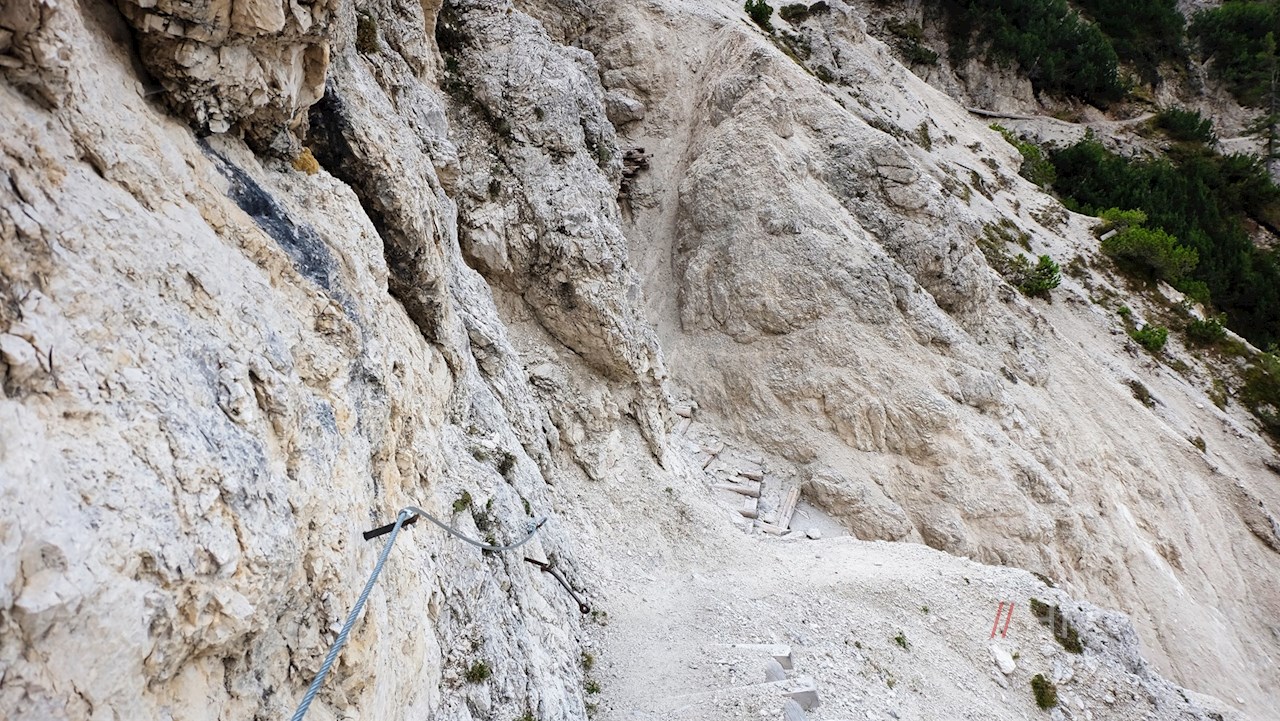 Dietro il limite del bosco, lo stretto sentiero, che in alcuni punti si trova a ridosso delle ripide pareti rocciose, si snoda fino all'altopiano di Monte Piano in uno scenario mozzafiato. Alcuni passaggi sono protetti da gradini di legno e corde di sostegno.