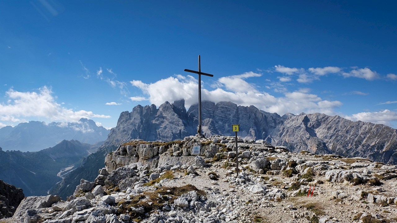 Infine, sul pianoro sommitale, si apre un panorama indimenticabile: Intorno svettano imponenti montagne dolomitiche come le famosissime Tre Cime di Lavaredo, il massiccio Monte Cristallo o la suggestiva Croda Rossa.