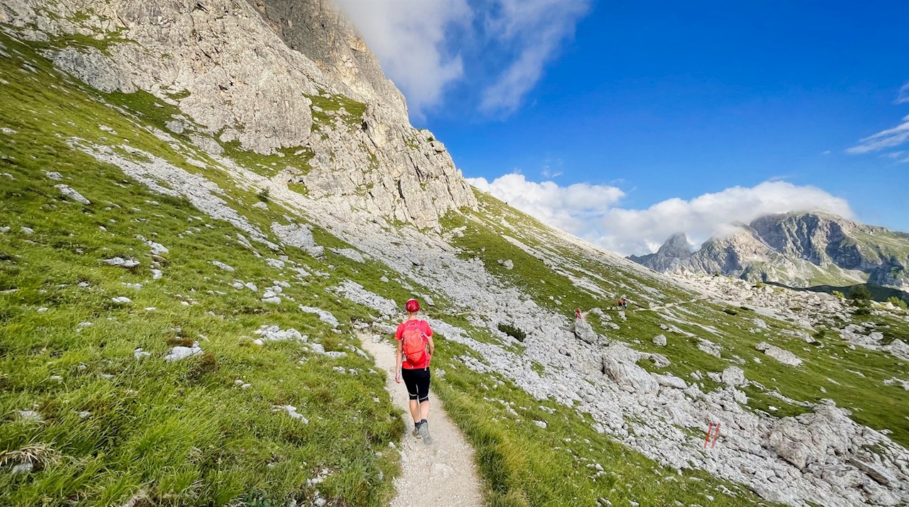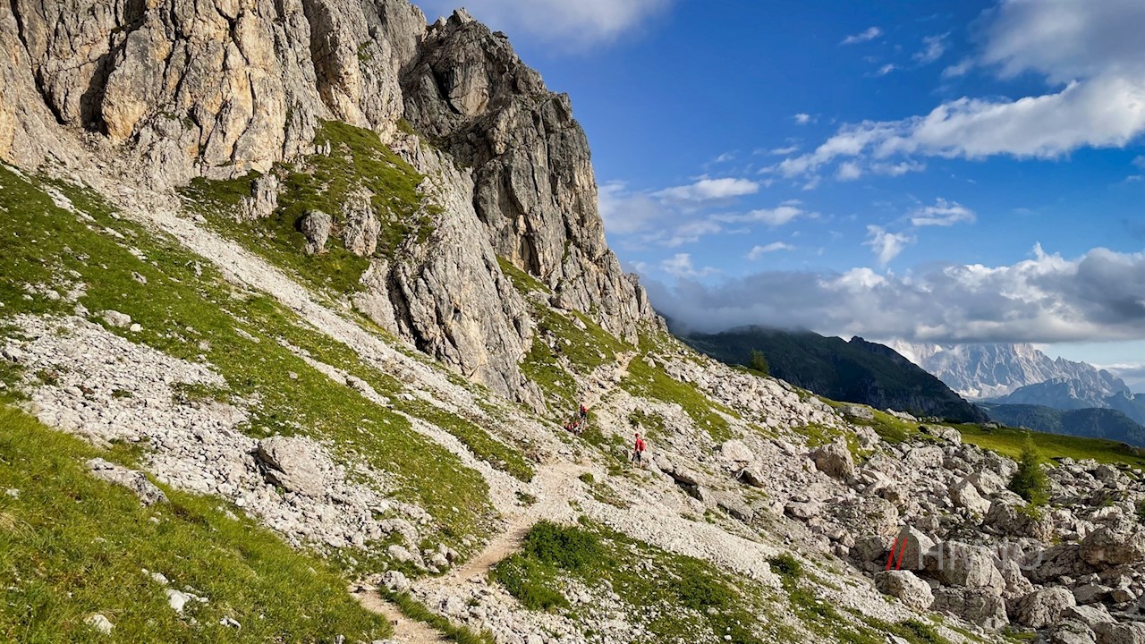 Infine, il sentiero sale in ripidi tornanti con travi di legno fino alla Crepe dei Ronde, alta 2.182 metri. Qui, per la prima volta, entrano nel nostro campo visivo le ripide pareti rocciose delle Cinque Torri, che si ergono tra verdi prati di montagna.