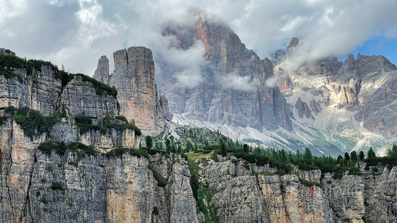 Ai loro piedi si trova il rifugio Scoiattoli, la nostra prima meta escursionistica. L'apprezzato rifugio è noto per il suoi piatti raffinati, serviti sulla terrazza panoramica e nella luminosa sala da pranzo. In questo contesto idilliaco, è difficile pensare che l'area delle Cinque Torri sia stata teatro di una guerra di montagna con gravi perdite durante la prima guerra mondiale.