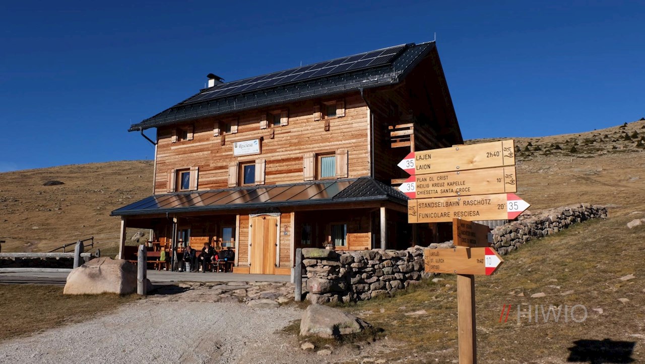 Da Ortisei si può anche prendere la funivia Resciesa fino a 2.095 m. Dalla stazione a monte c'è un ampio sentiero quasi pianeggiante, che porta al rifugio Resciesa a circa 1,5 km di distanza.