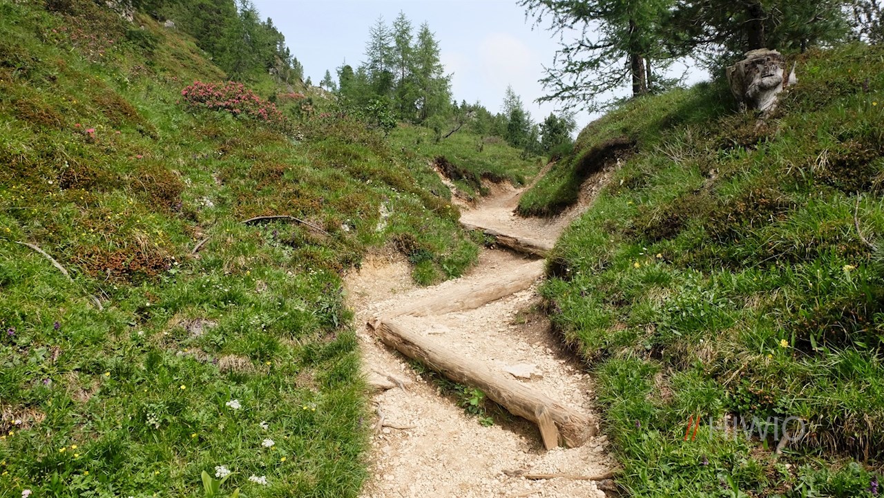 Seguendo il segnavia n.424, si cammina attraverso una piccola area boschiva, dietro la quale si estendono i prati fioriti del Pian dei Menis, incorniciati dalle imponenti Dolomiti.