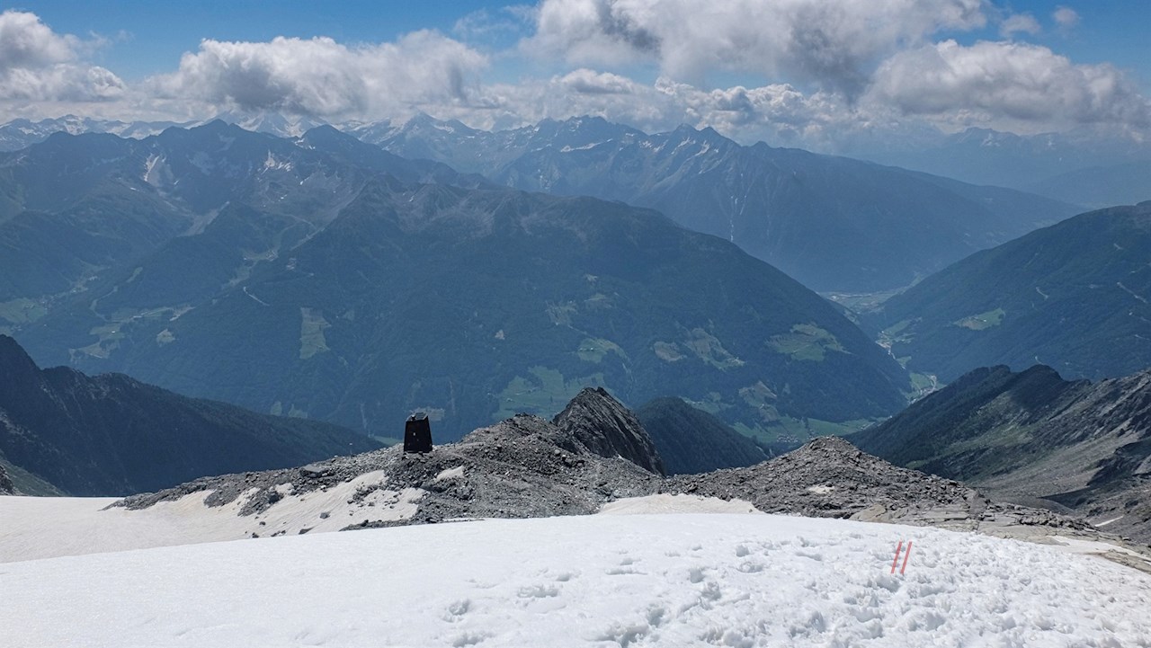 Dietro di loro, il sentiero sale attraverso massi ben segnalati fino al nuovo rifugio Sasso Nero, situato a 3.026 m sul livello del mare. La forma futuristica di questo rifugio più alto della valle Aurina è stato ispirato da un masso liberato dai ghiacciai.