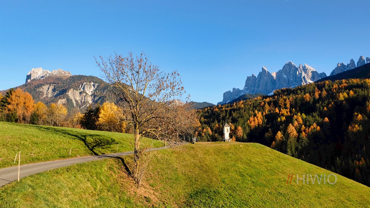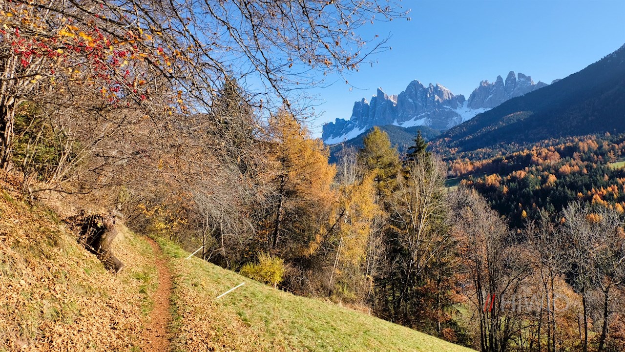 Dietro di esso, si trasforma presto in un sentiero di boschi e prati. Attraversa prati e boschetti soleggiati in dolci saliscendi, aprendo panorami da sogno sulle leggiendarie Odle della val di Funes, uno dei motivi più fotografati delle Dolomiti.